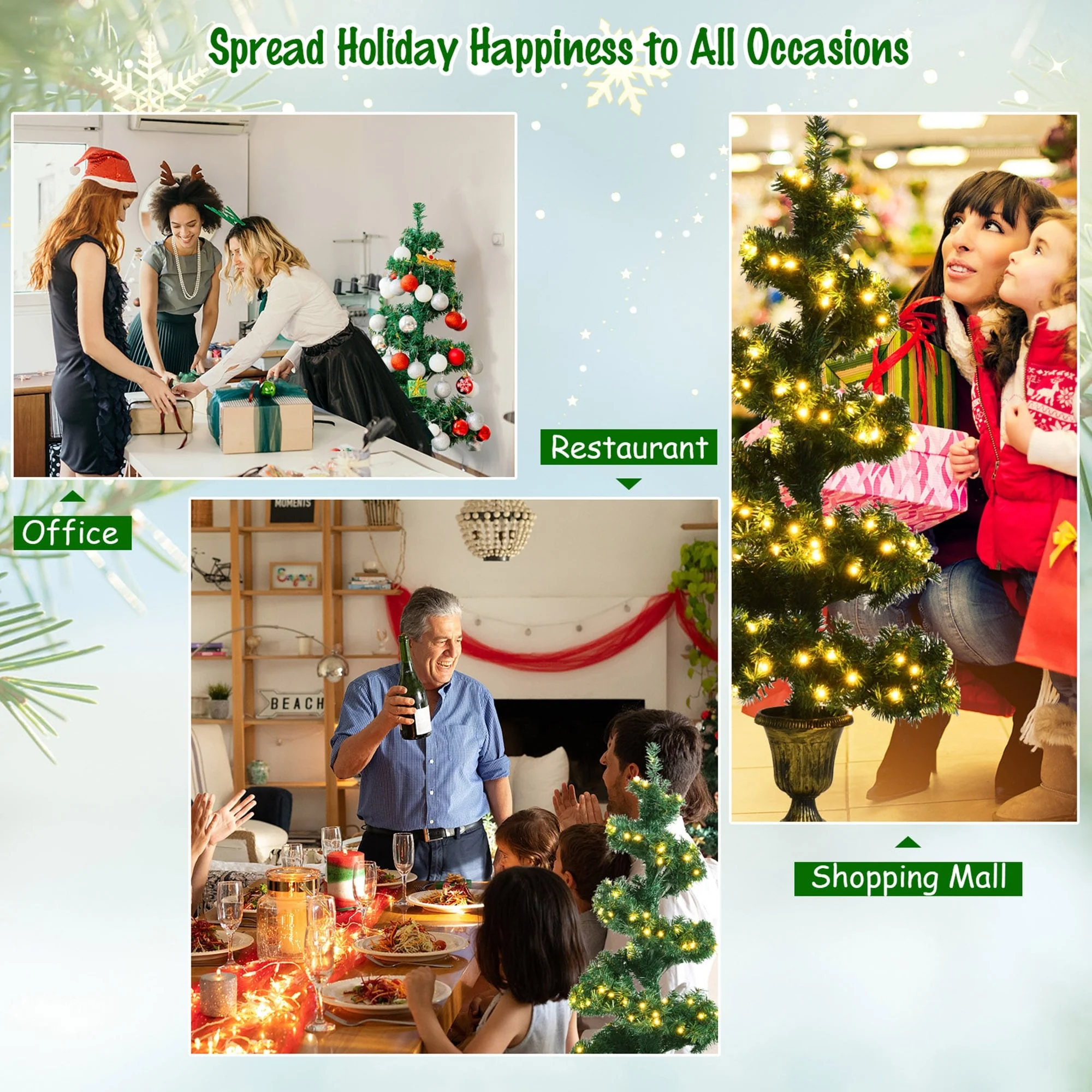 Bring home strong festival atmosphere with this spiral verdant artificial Christmas tree. Perfect for either home or commercial place, this Christmas tree spreads holiday joy and sincere wishes. It stands at 4 feet tall, with 364 branch tips, and composes lush appearance in helical tree shape, being an eye-catching decoration to let you feel the Christmas spirit that is wafting through the decorated places. More, premium PVC leaves can not only make the Christmas tree odor free, but also provide a safe using experience season after season. It also comes with a stable retro urn stand, so that the Christmas tree can stand straightly without toppling. This verdant spiral Christmas potting perfectly matches with entryway, mantel and gate.
