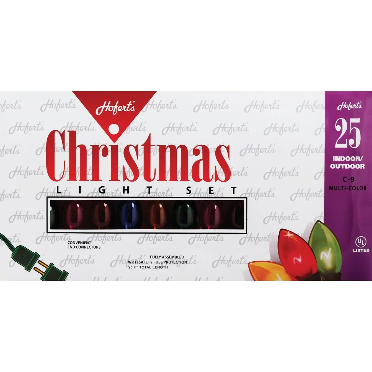 Incandescent holiday string light set. 25-light, C9 incandescent light set with green wire. Features 12-inch bulb spacing, 25-feet total length, and 24-feet lighted length. Ideal for indoor or outdoor use. 20-gauge wire with 6-inch lead and 6-inch tail.