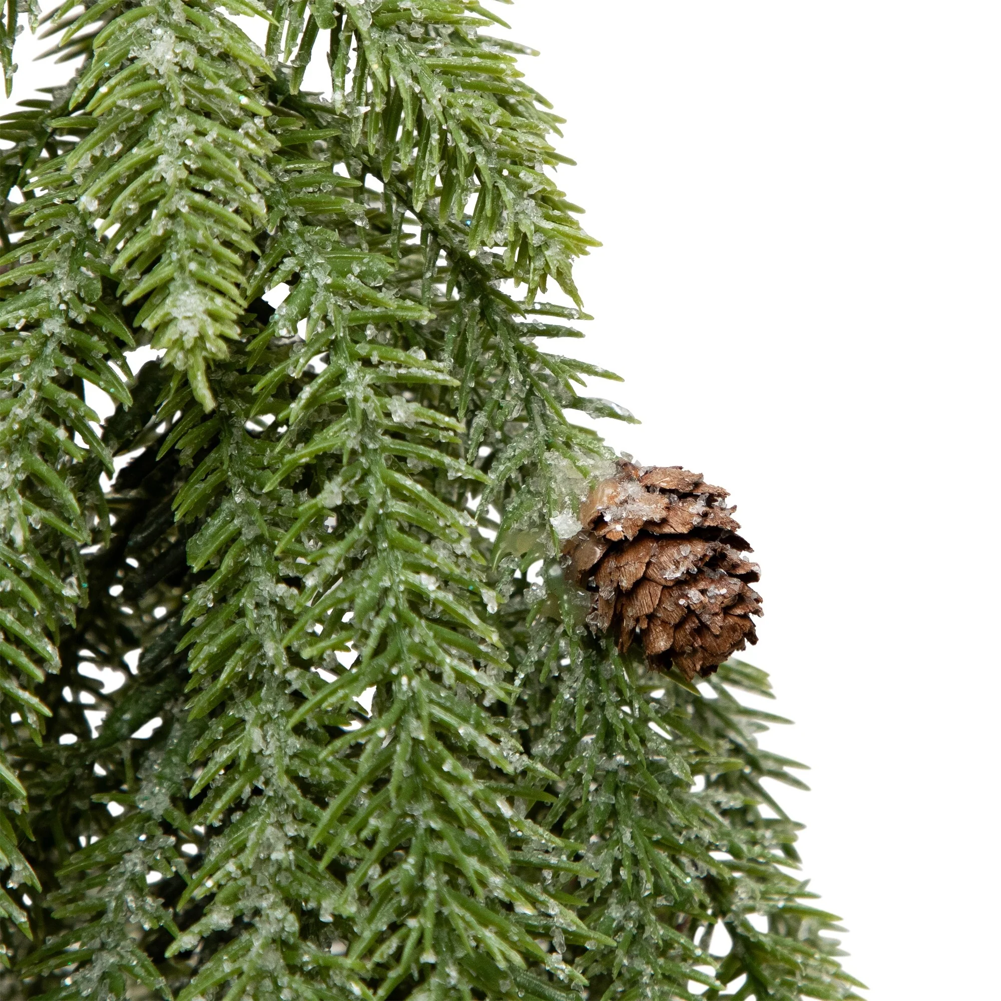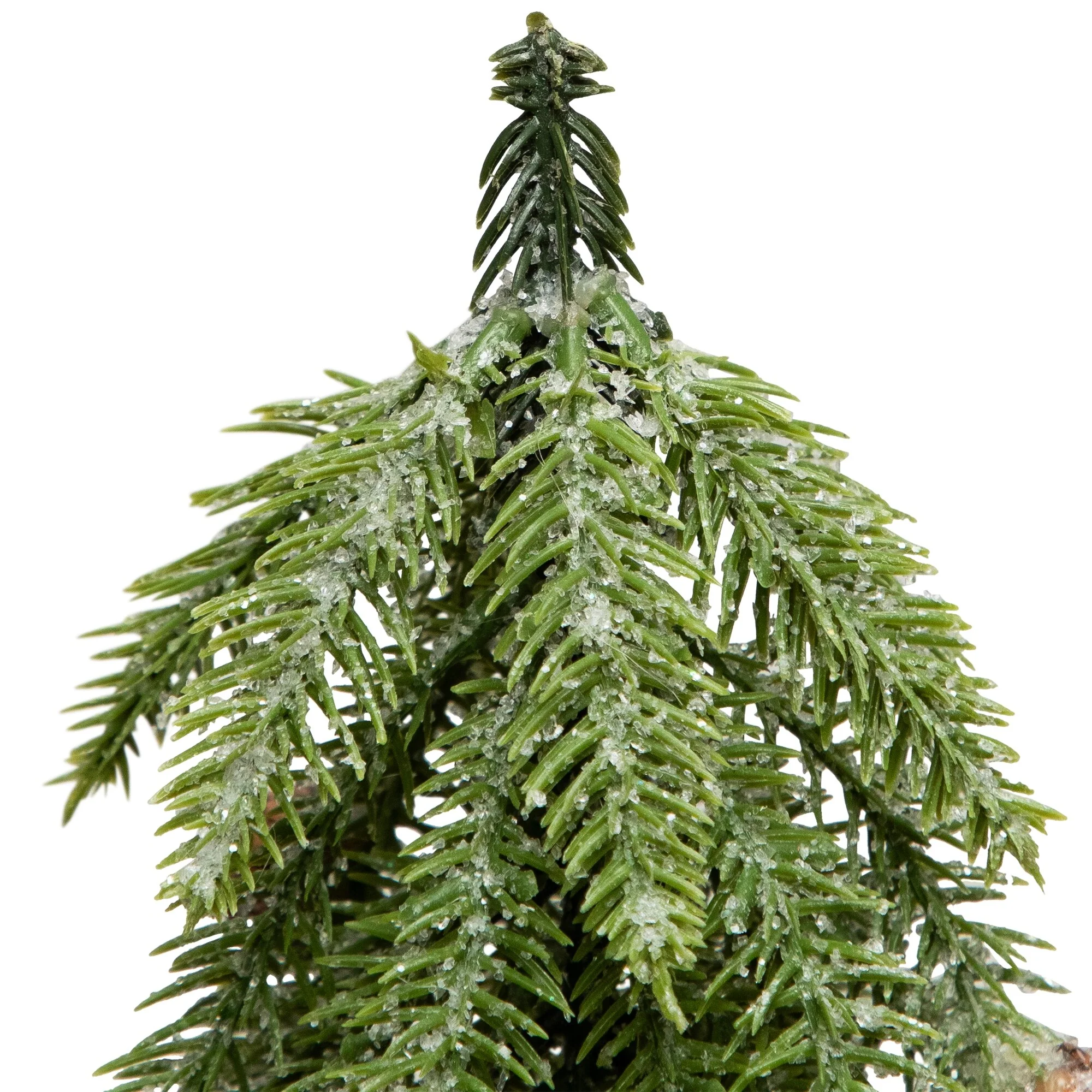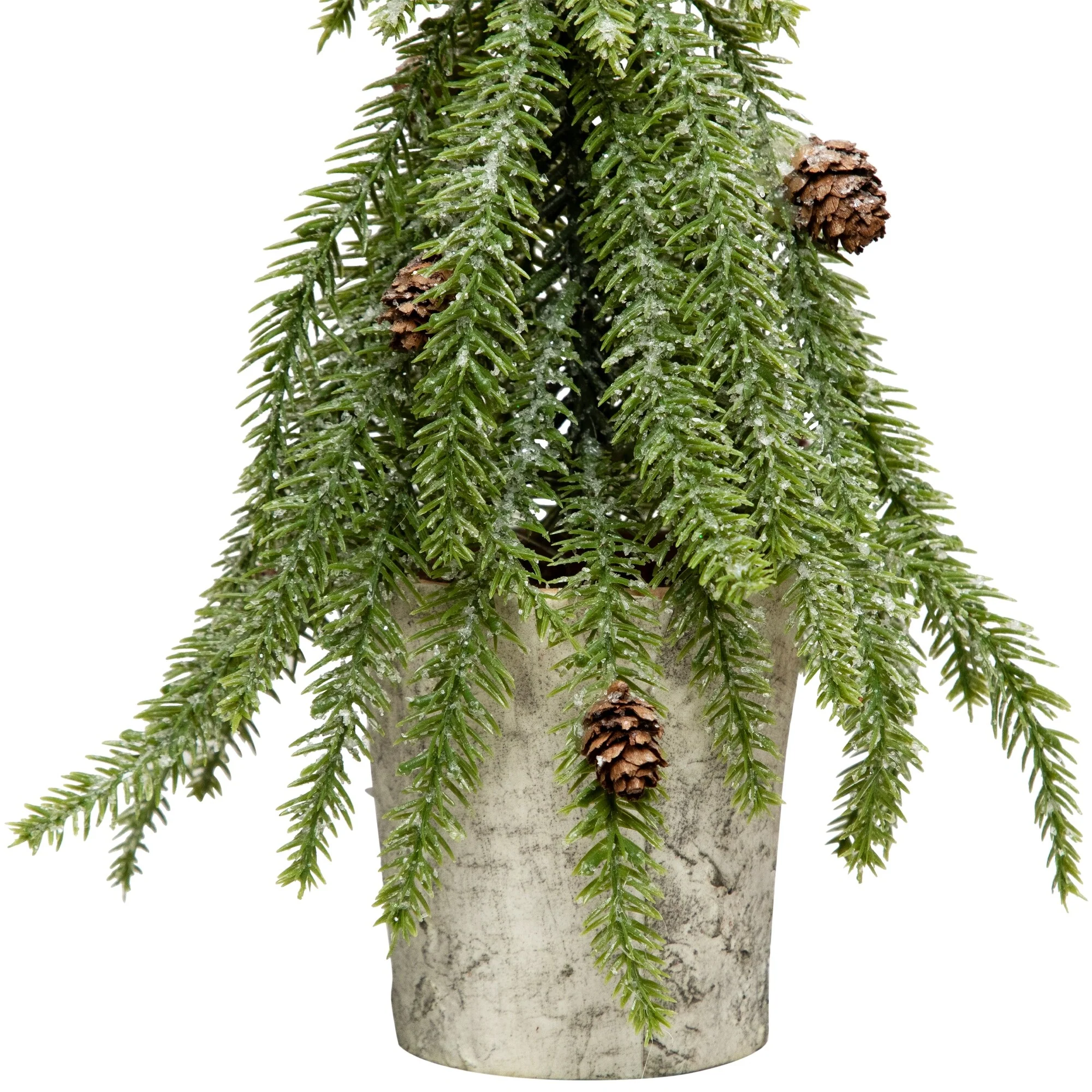 Add a touch of winter charm to your holiday decor with this icy pine mini tree. This petite tree captures the enchanting beauty of a snowy pine forest, with pine cones and lifelike branches dusted with a delicate layer of frost. Nestled in a birch wood look pot, it adds a touch of rustic elegance to any space. Perfect for tabletops, mantels, or as a centerpiece, this mini Christmas tree brings a festive ambiance to your home.