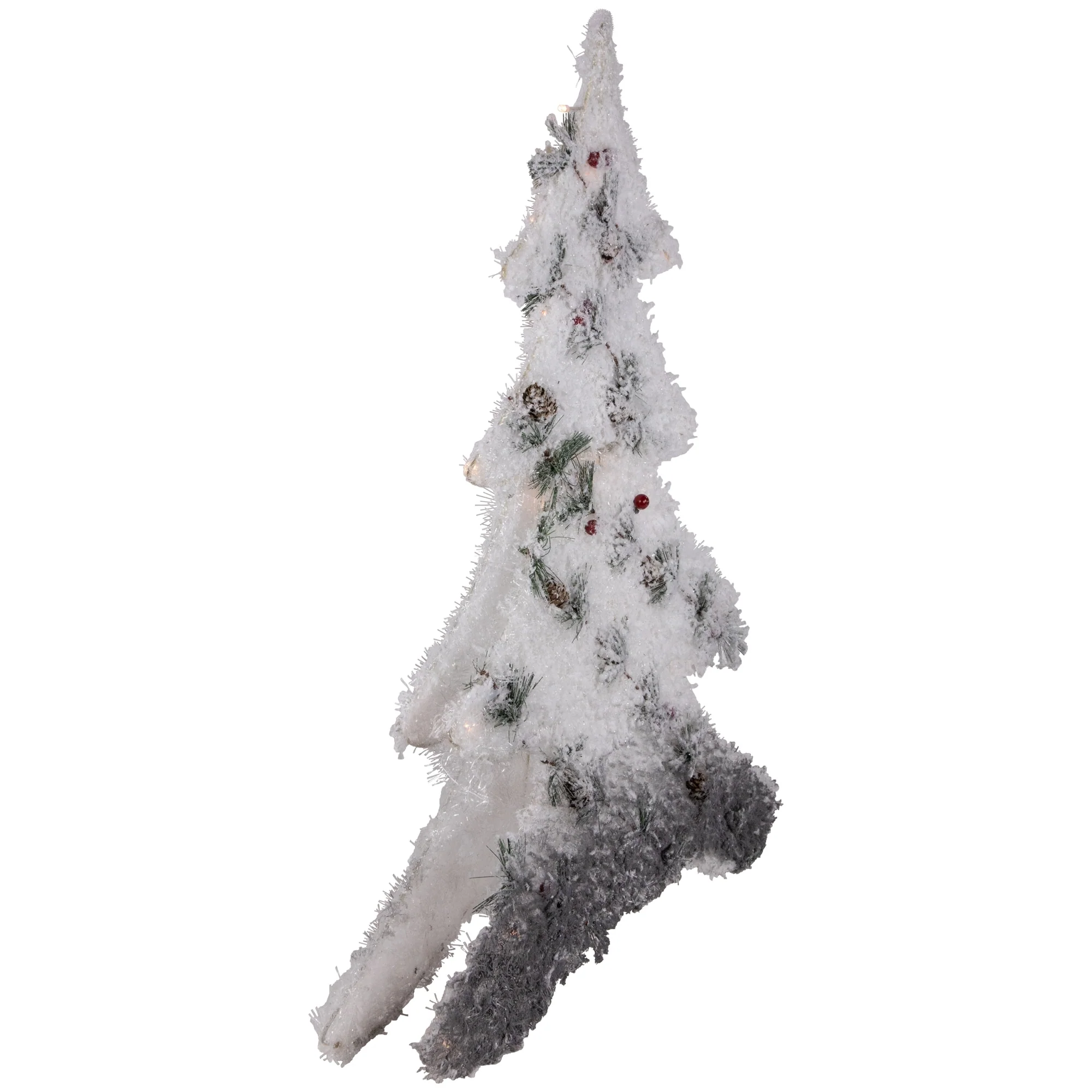 Traditional meets modern with this lighted tree decoration. Retro tinsel combines with modern lines of pine needles, creating a one of a kind showpiece. Pre-lit with warm white LED lights, it offers the perfect holiday glow. Battery operated means it can be placed anywhere!