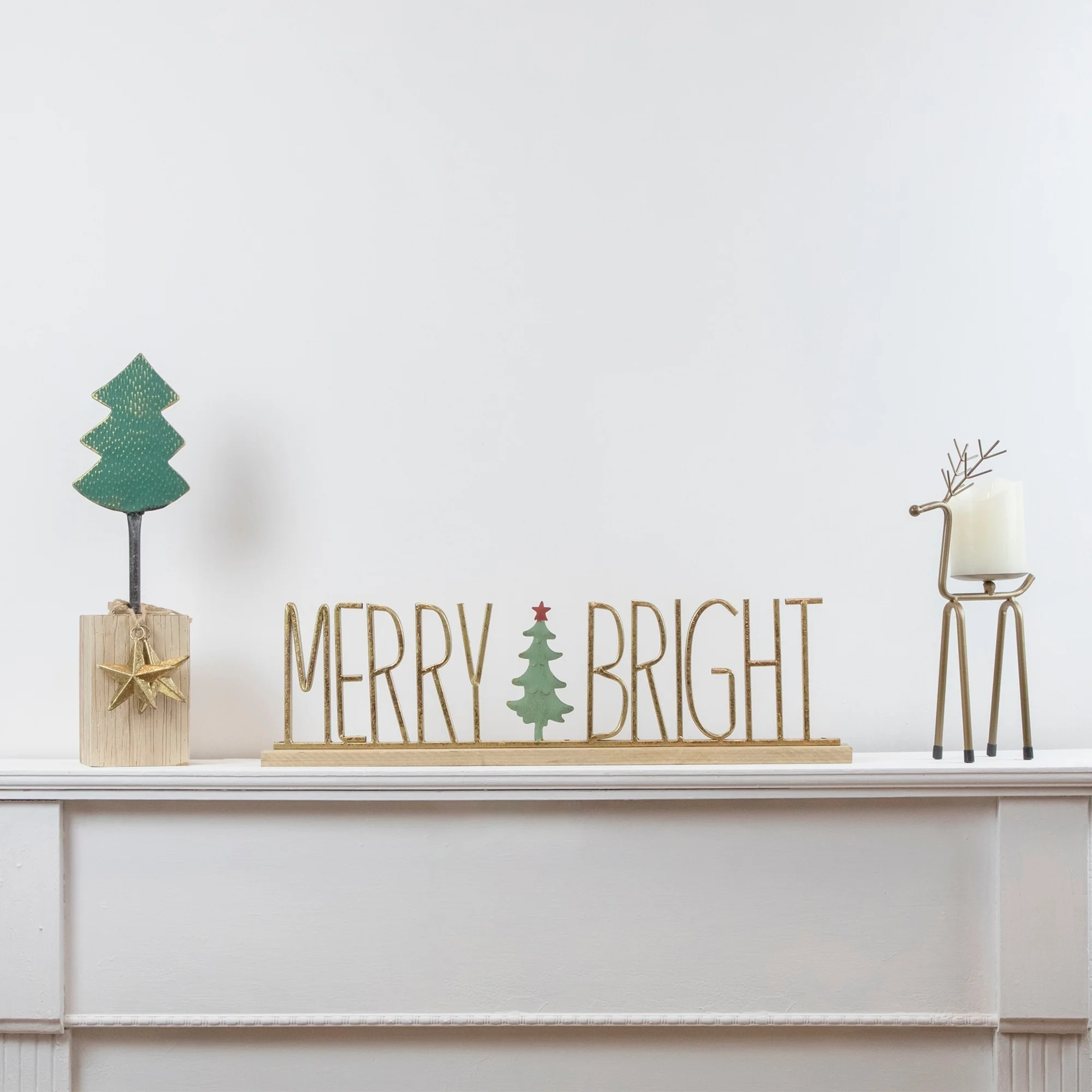 This little tree packs a punch of country charm with it's simple yet chic construction. A distressed, green metal tree is set in a chunky block of wood, decorated with 2 stars hanging from a natural jute string. A truly unique way to represent the holiday.