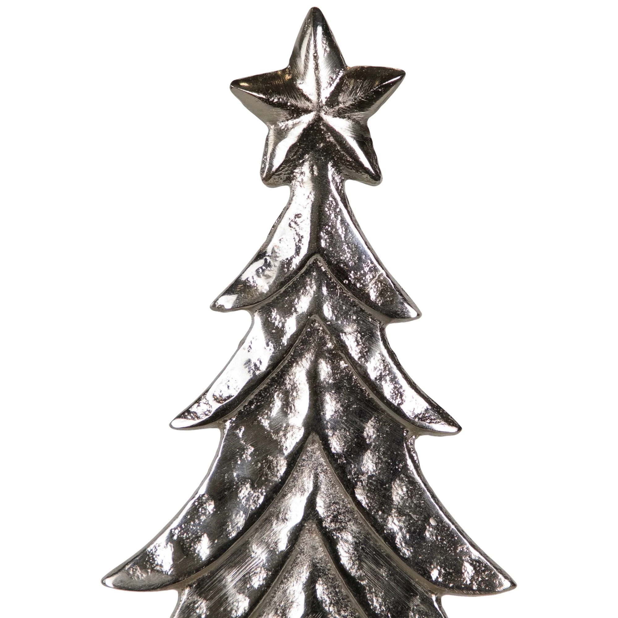 Embrace the warmth and joy of the holidays with this set of two exquisite tabletop decorations. Crafted from durable silver hued metal with a charming dented texture, these Pine tree-shaped accents are adorned with a whimsical star topper, evoking the spirit of the season. Each piece is securely placed on a sturdy rectangular wooden base, ensuring stability and longevity.