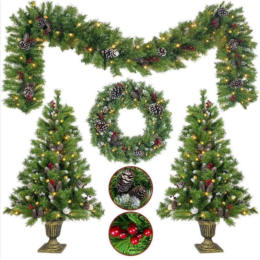 Hang the winter boughs and decorate your entryway with this stunning, pre-lit 4 Piece Green Pine Artificial Christmas Tree Set. Christmas trees set gets you all the ambience the holiday brings without any of the mess the holiday brings. Spending time together with friends and family is really what Christmas is all about, and your tree is something you shouldn't have to mess with (ugh). Our entry door decorations will help take some of the hassle out of the holiday. Little mess, simple assembly, and impeccable ambience help make your season just a little brighter. This complete set includes everything you need for a stunning entryway: a set of entrance trees, a wreath and a garland pre-strung with LED white lights. Each piece has pine cone and cherry accents and is pre-strung with incandescent mini-lights that surround your front door with softly glowing light. The compact trees features much branch tips for a realistic look and will look stunning on either side of your front door or porch steps to welcome your guests. These Pre-Lit Christmas Tree Entryway Set is the perfect way to welcome family and friends, and can be counted upon to bring Christmas cheer season after season. Ideal for Christmas party, fireplace, bedroom, garden, balcony, shopping malls, mantels, doors and covered front porch staircase and many other decorations.