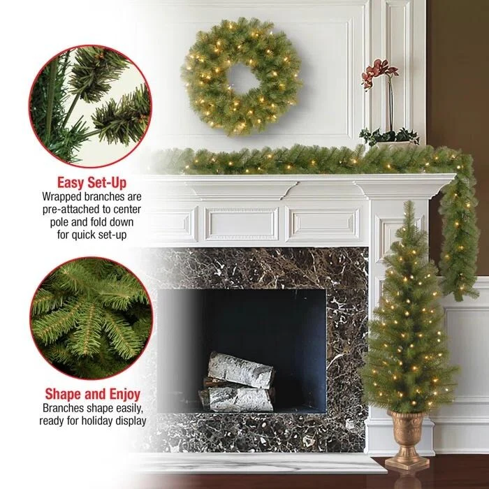 - Include a 24" wreath, a 9ft garland and two 4ft entrance trees