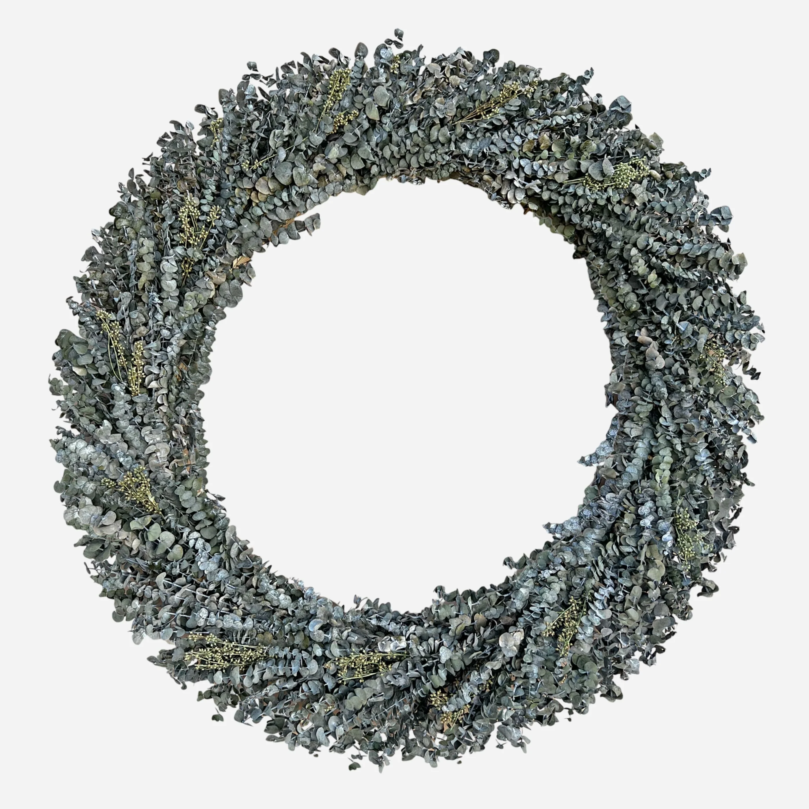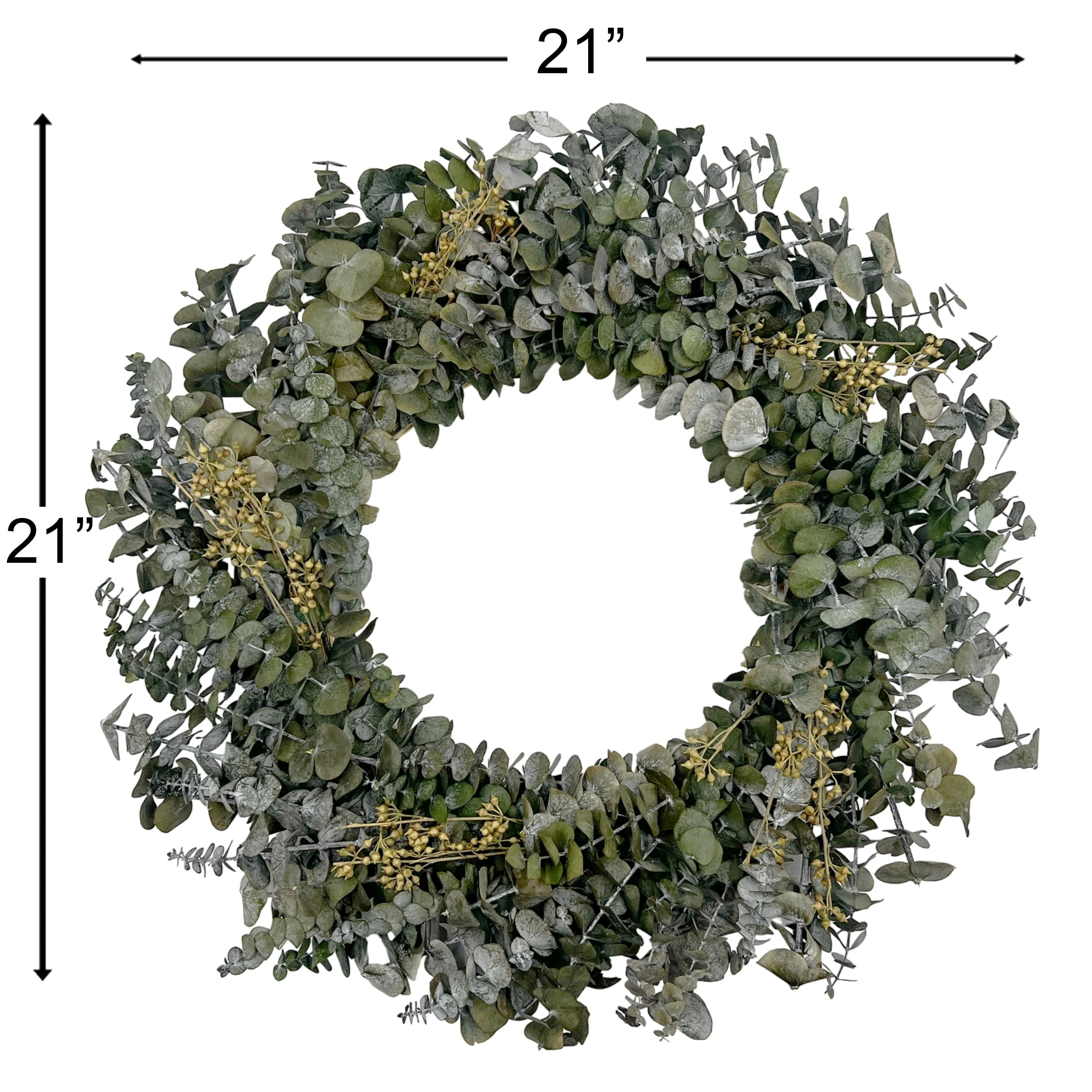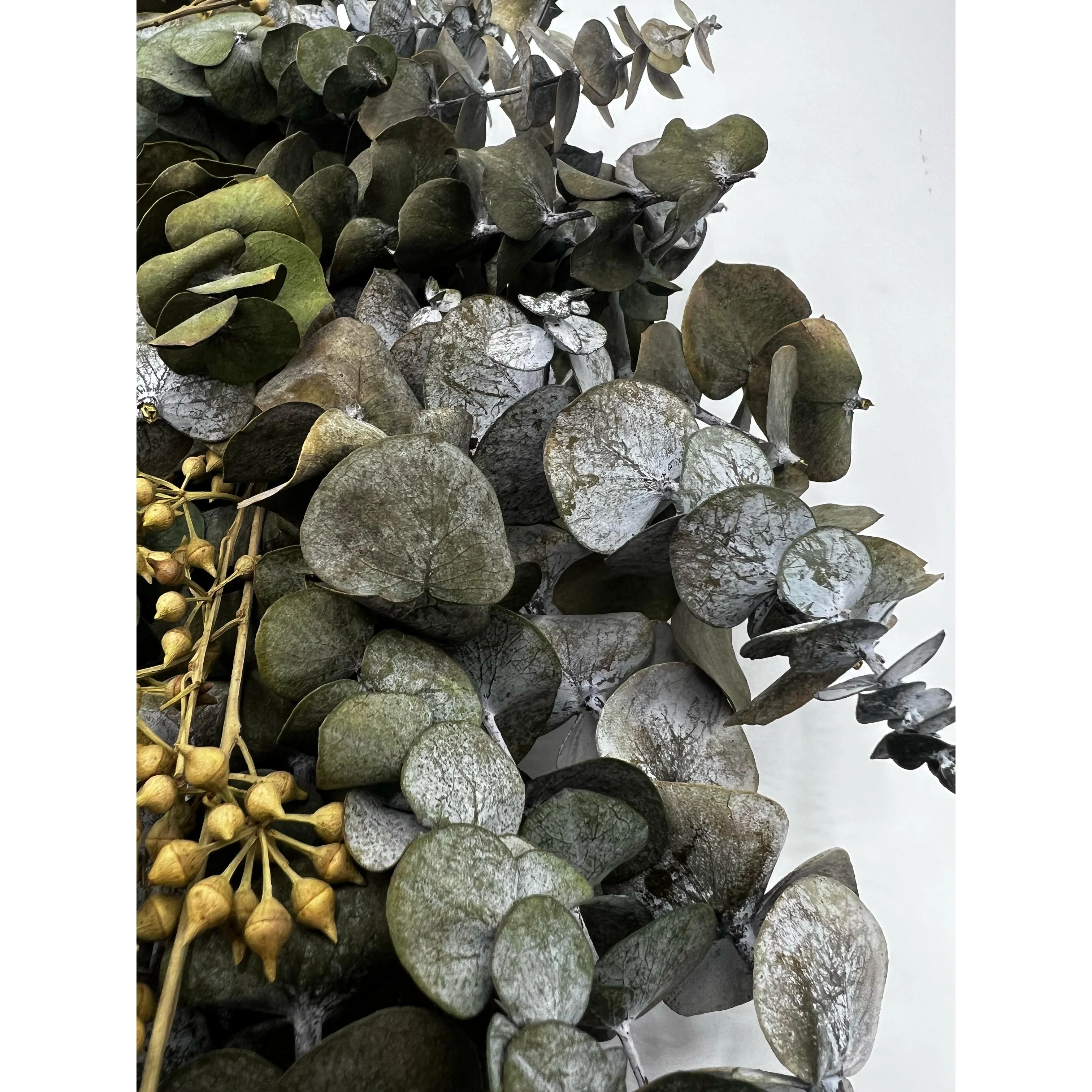 The Preserved Decorative Real Eucalyptus Wreath, sized at 12/21/28/50 inches in diameter, offers a fresh and natural touch to any setting. Crafted with genuine eucalyptus leaves, meticulously preserved to maintain their vibrant green color and delicate texture, this wreath brings the invigorating scent of eucalyptus into your home. Its lush foliage and classic design make it a versatile decor piece, perfect for hanging on doors, walls, or as a centerpiece, infusing your space with timeless botanical charm.