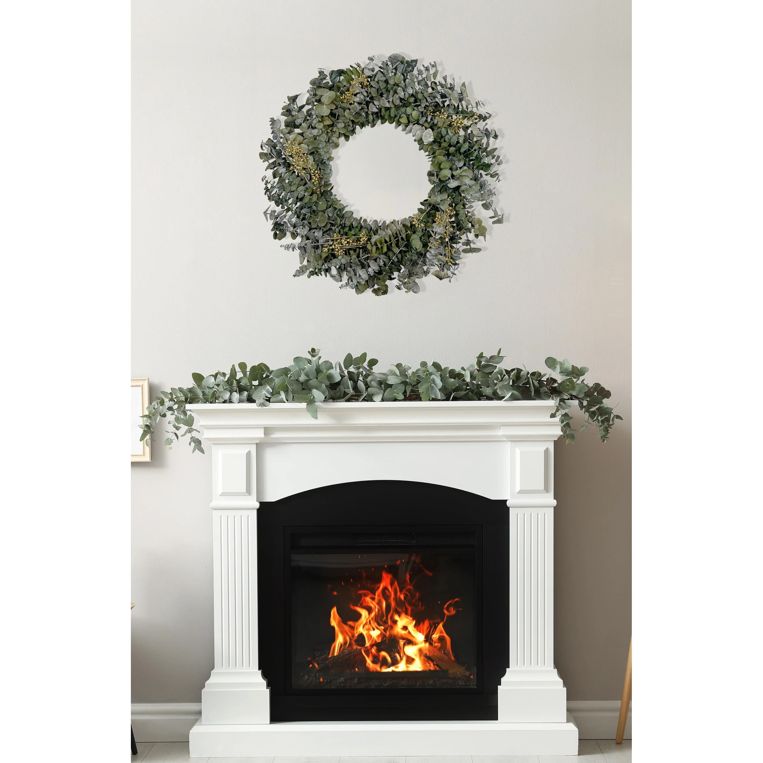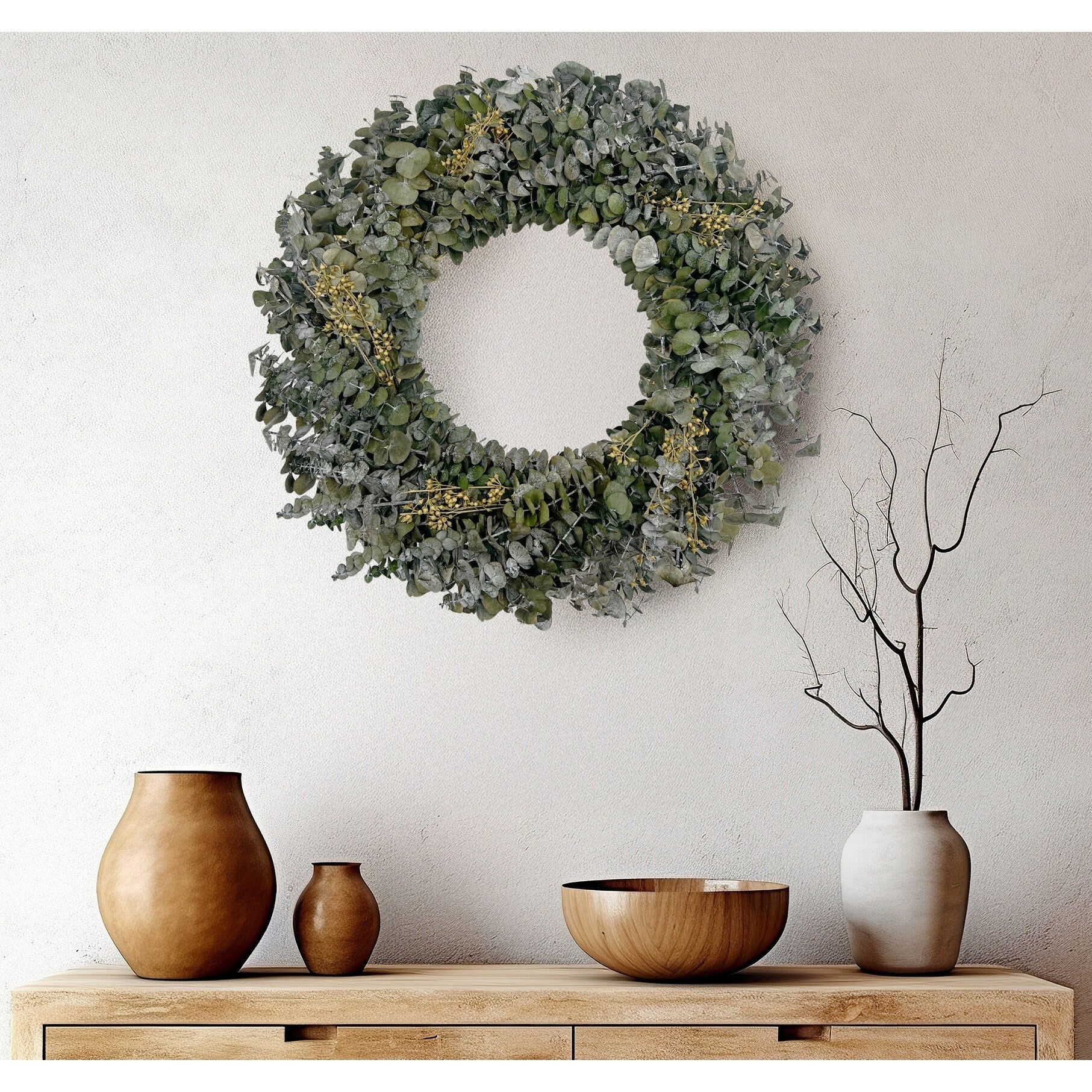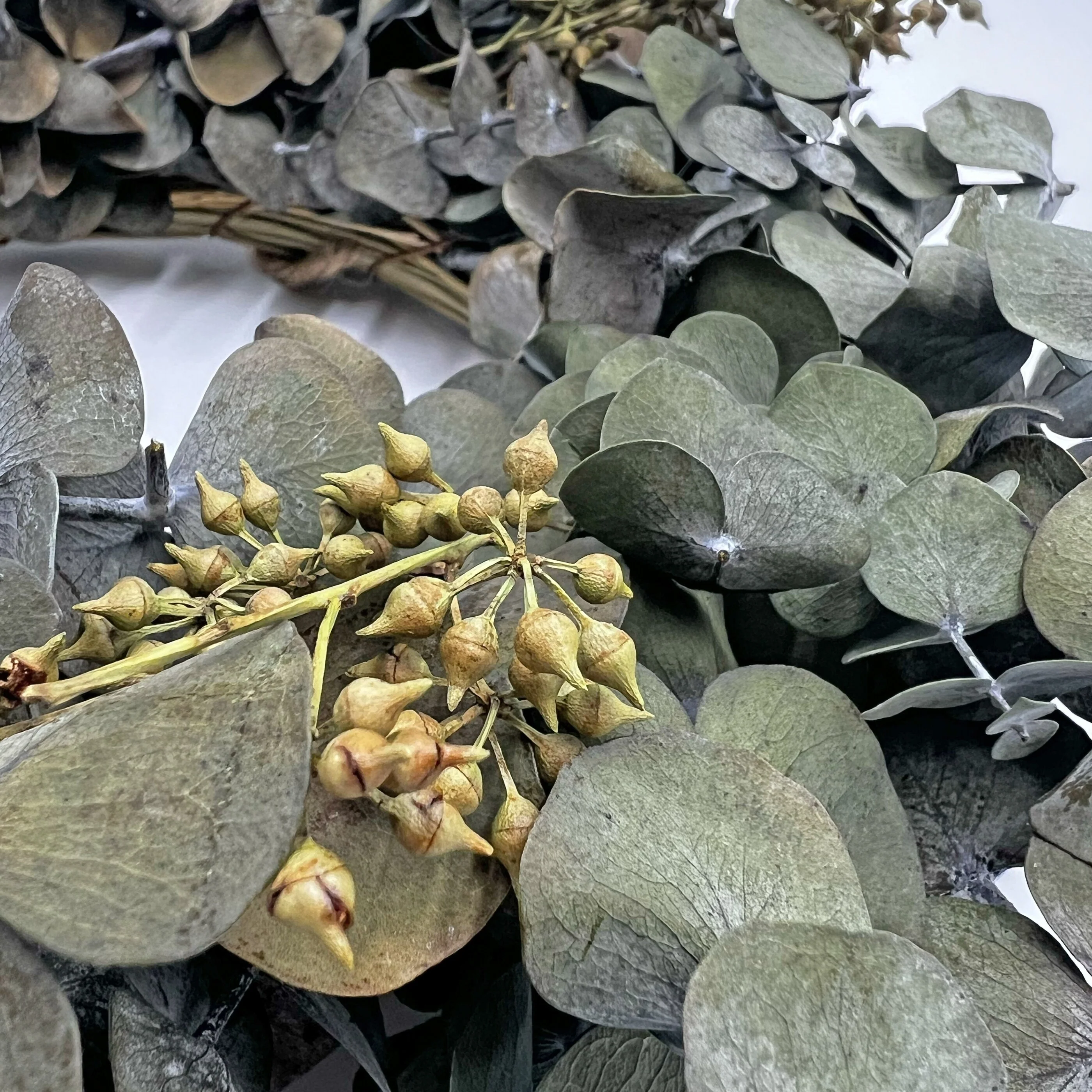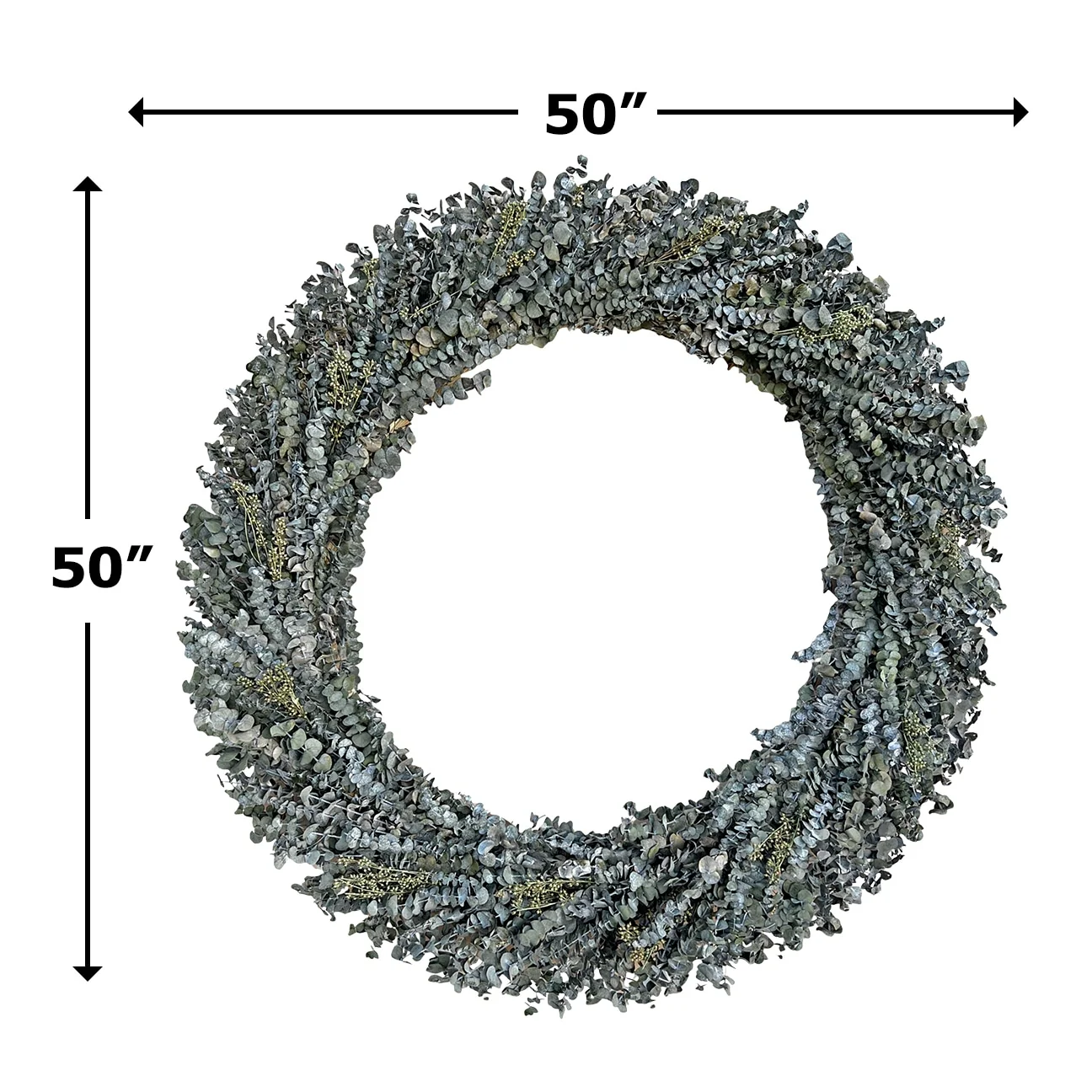 The Preserved Decorative Real Eucalyptus Wreath, sized at 12/21/28/50 inches in diameter, offers a fresh and natural touch to any setting. Crafted with genuine eucalyptus leaves, meticulously preserved to maintain their vibrant green color and delicate texture, this wreath brings the invigorating scent of eucalyptus into your home. Its lush foliage and classic design make it a versatile decor piece, perfect for hanging on doors, walls, or as a centerpiece, infusing your space with timeless botanical charm.