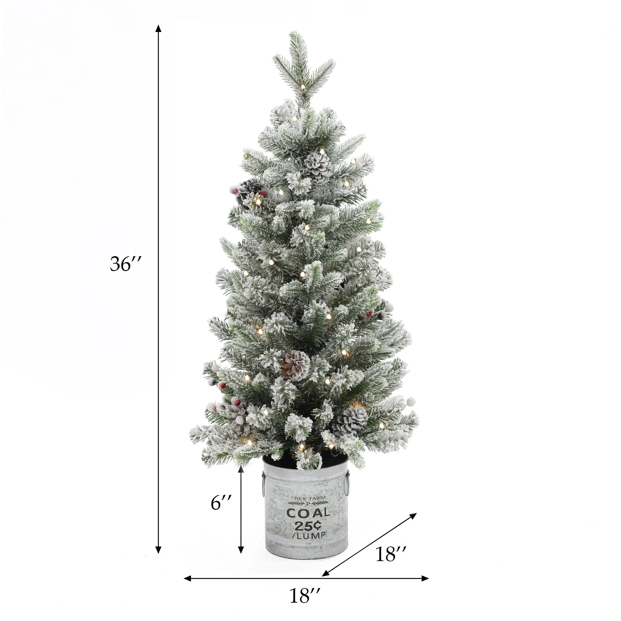 To create a festive environment this season, decorate your home, office, or special event with this sweet 3-foot artificial tree. Crafted from a combination of quality PVC and PE branches, this holiday decoration is made to bring Christmas cheer for years to come. Designed and decorated to feel lifelike and realistic, the lush artificial pine tree is flocked to give a snowy appearance, adorned with pine cones and berries. It has the added convenience of pre-strung lights. The pre-strung lights are powered by 4 AA batteries (not included) and have a convenient 6-hour timer. In addition, this artificial pine tree is featured in a rustic silver farmhouse-style round metal pot that complements the natural beauty of the faux tree. The tree also makes a beautiful and creative gift for that special person this holiday!
