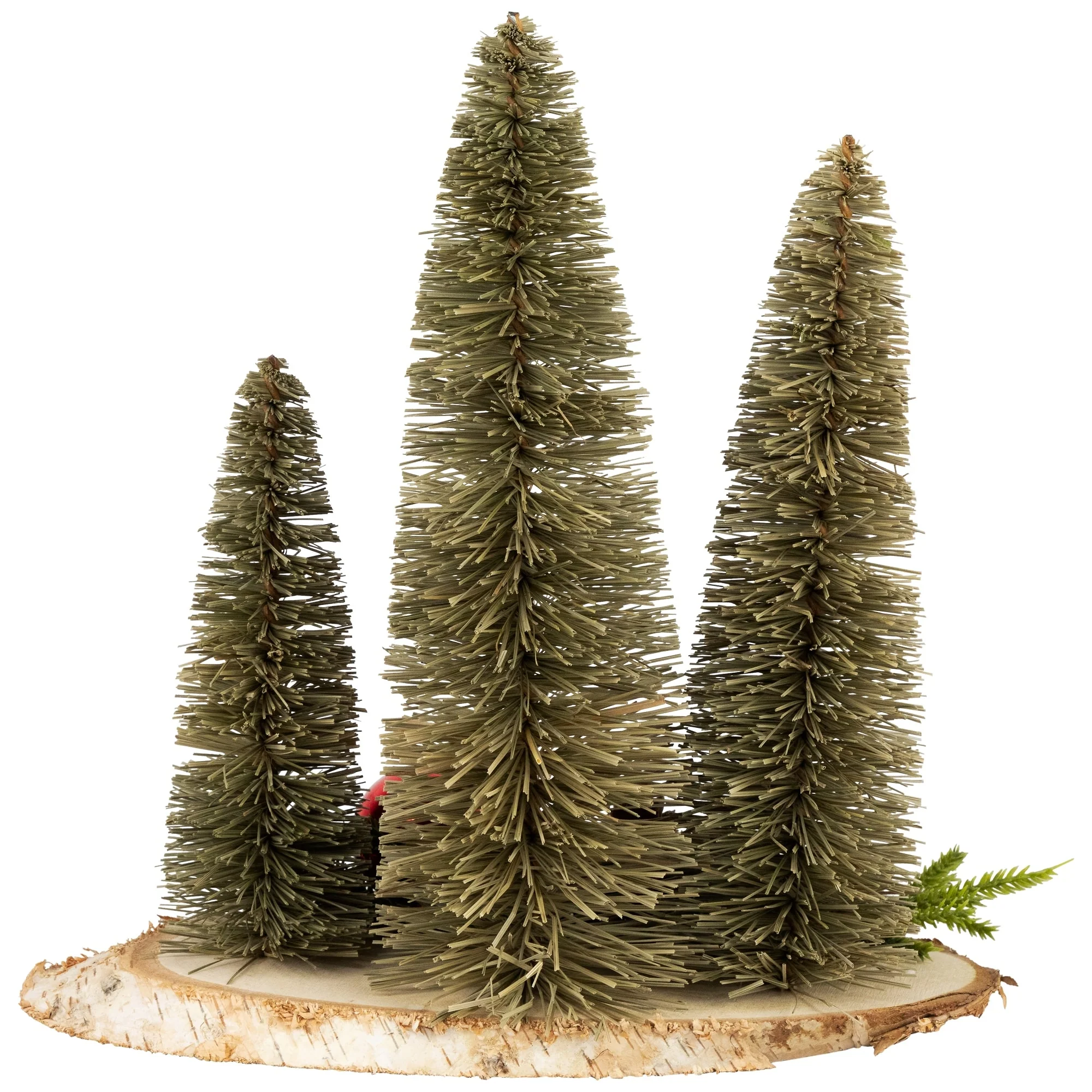 Bring the enchantment of a winter forest into your home with this Christmas decoration. This charming piece is composed of three meticulously crafted bottle brush trees adorned with delicate pine sprigs, rustic pinecones, festive berries, and a shiny, mini red ornament, all elegantly mounted on a live edge faux wood tree slab. Perfect for adorning tables, mantels, or shelves, it's sure to evoke a cozy spirit of nature in your home.