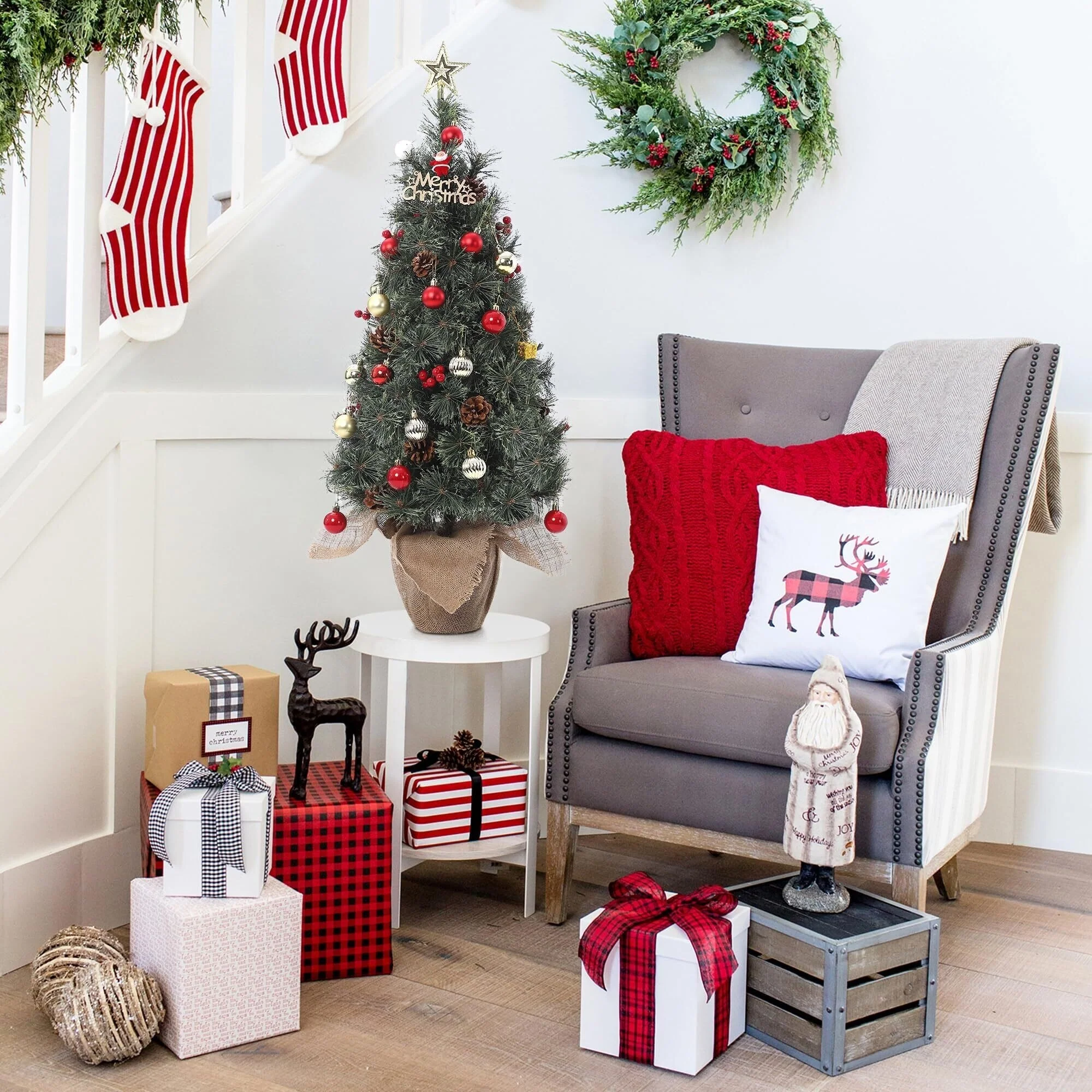 Mini Christmas Tree with 78 LED Lights Cloth Bag Base & Pine Cones & Red Berries