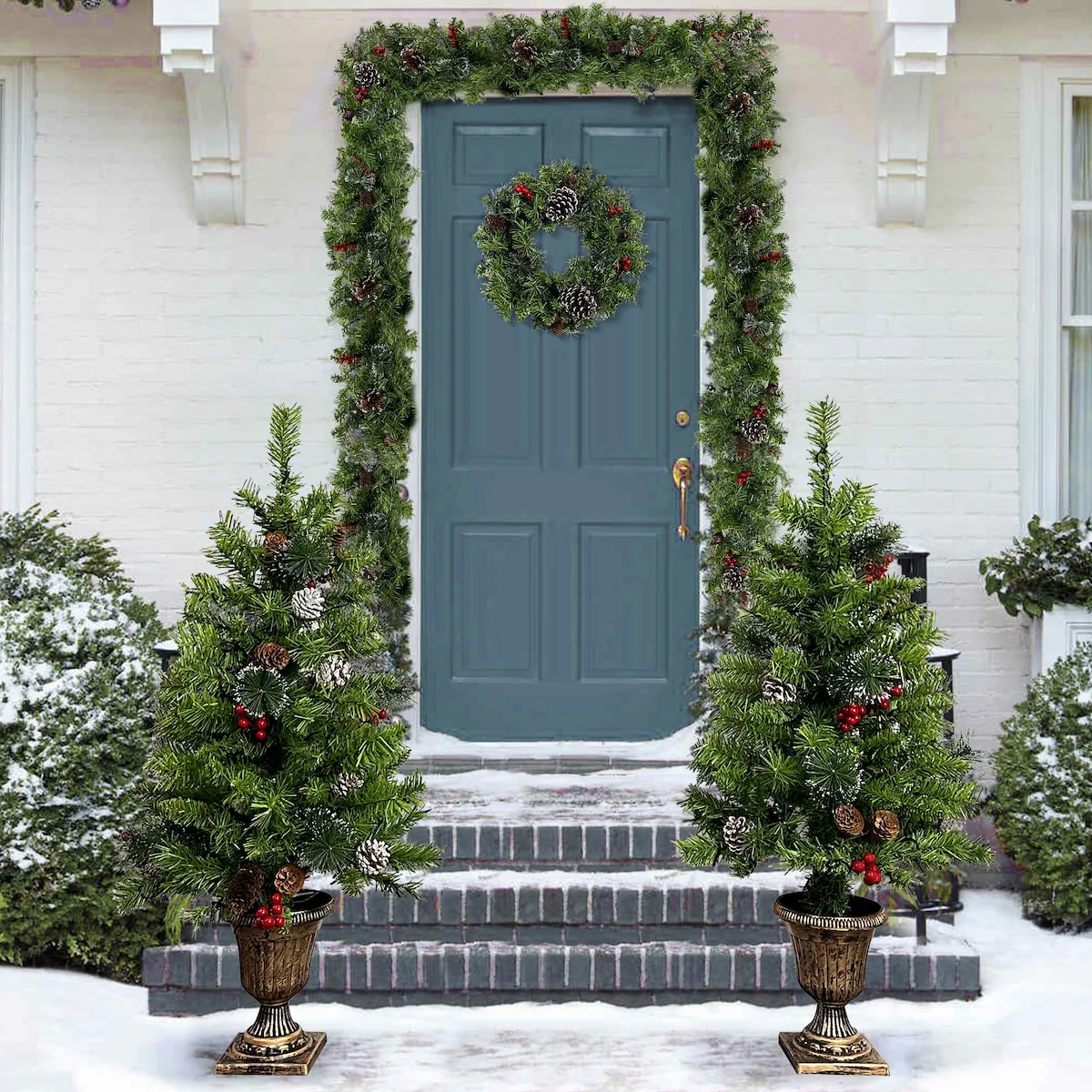 Pre-lit Xmas Tree Set with LED Lights, Garland, Wreath, and 2 Entrance Trees for Holiday Decor