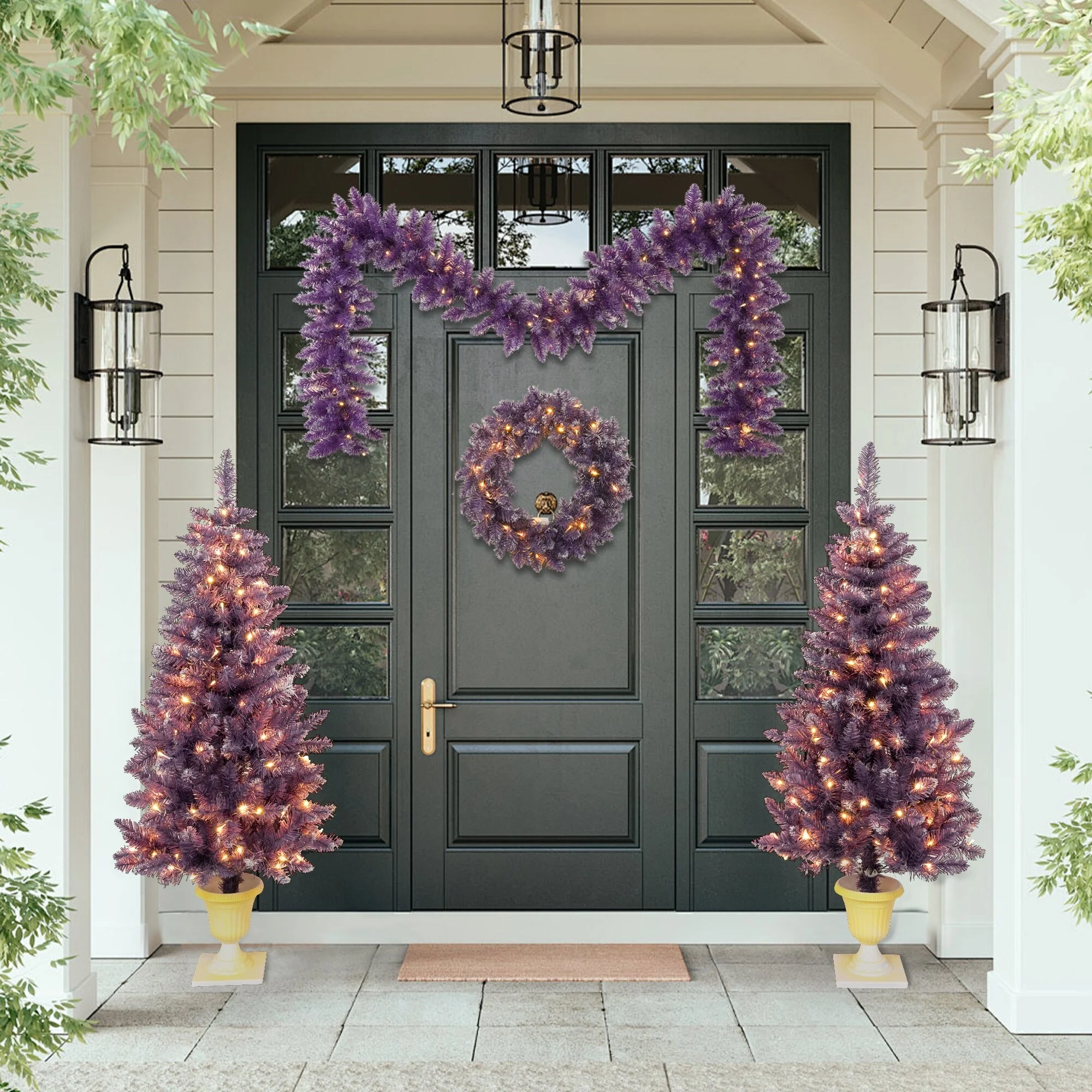 Purple Christmas Tree Set with 2 Entrance Trees, Wreath, and Garland, Pre-Lit LED Lights for Home Holiday Decoration