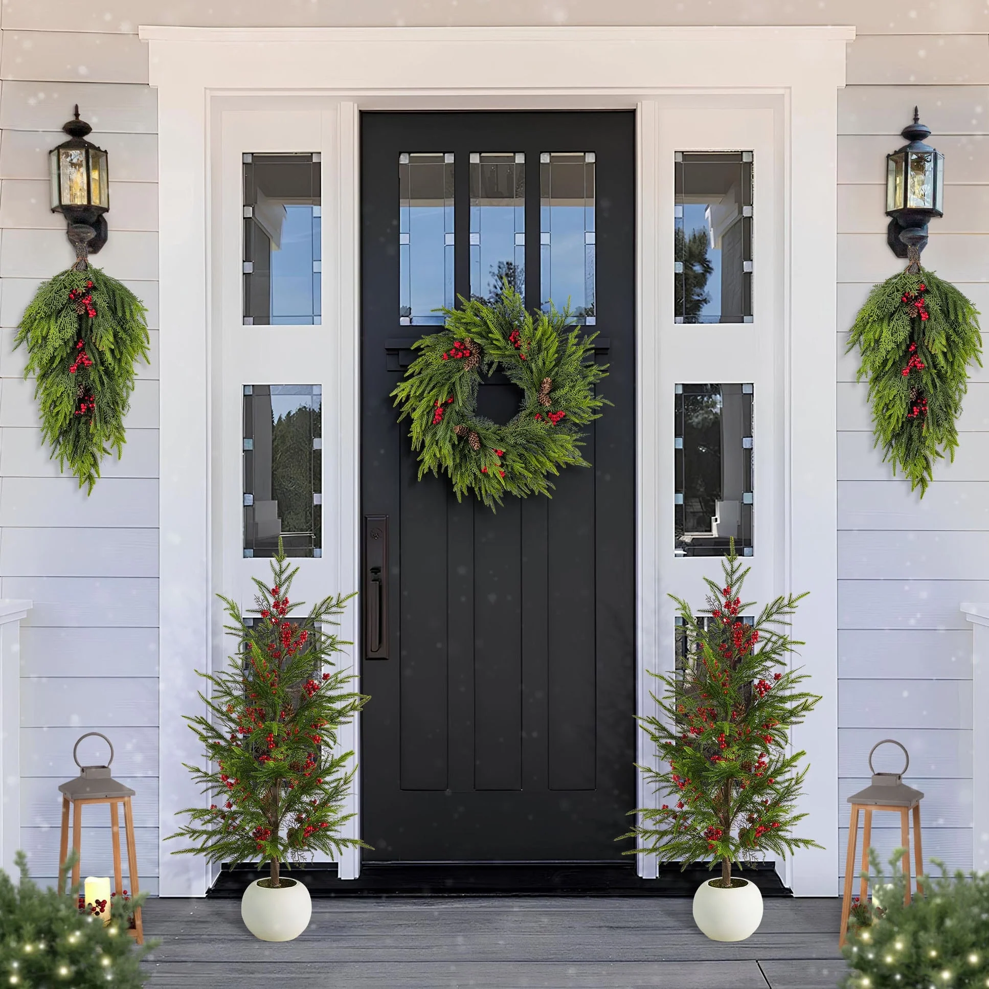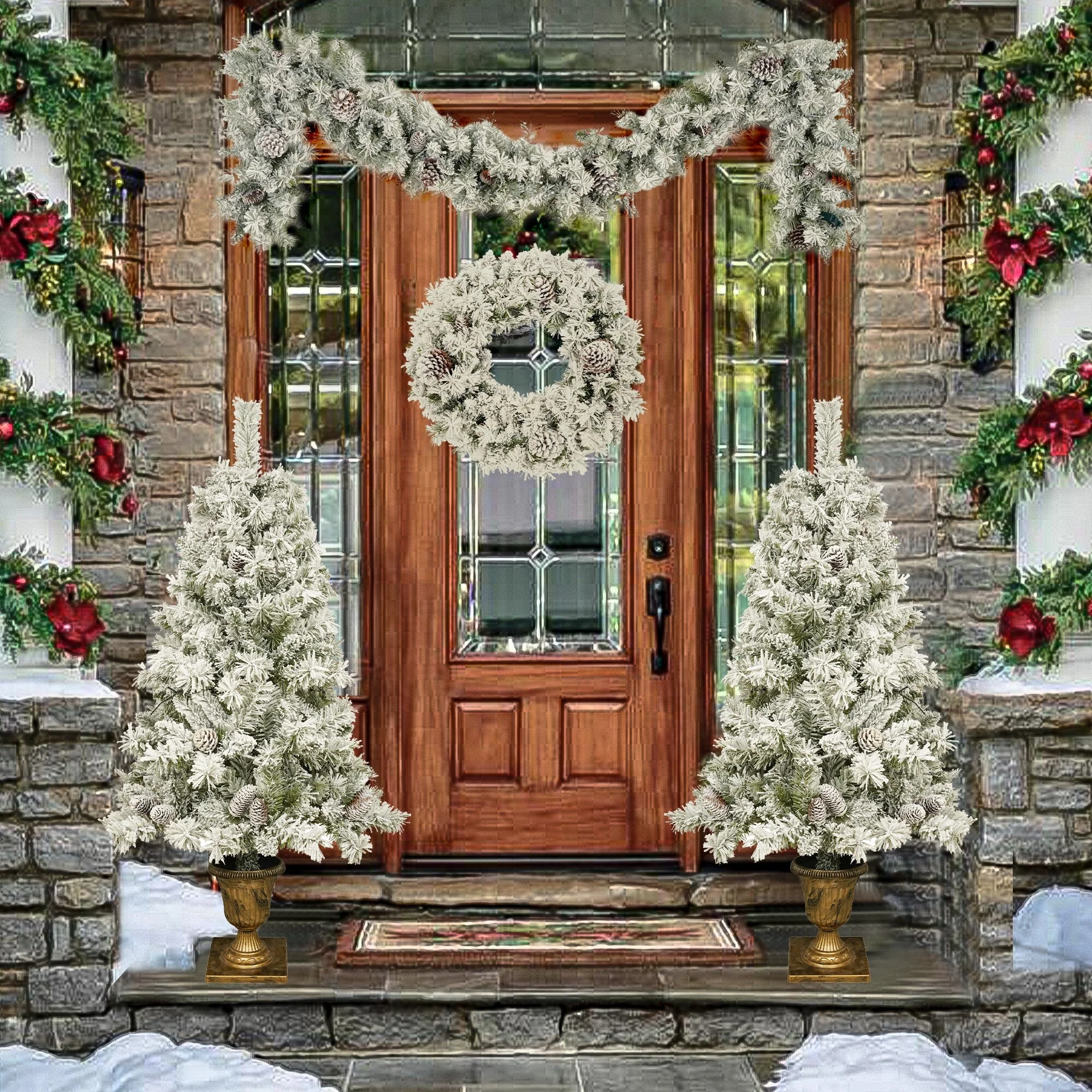Pre-Lit Christmas Decoration Set - Wreath, Garland & 2 Entrance Trees with 330 LED Lights, Perfect for Festive Entryway Decor