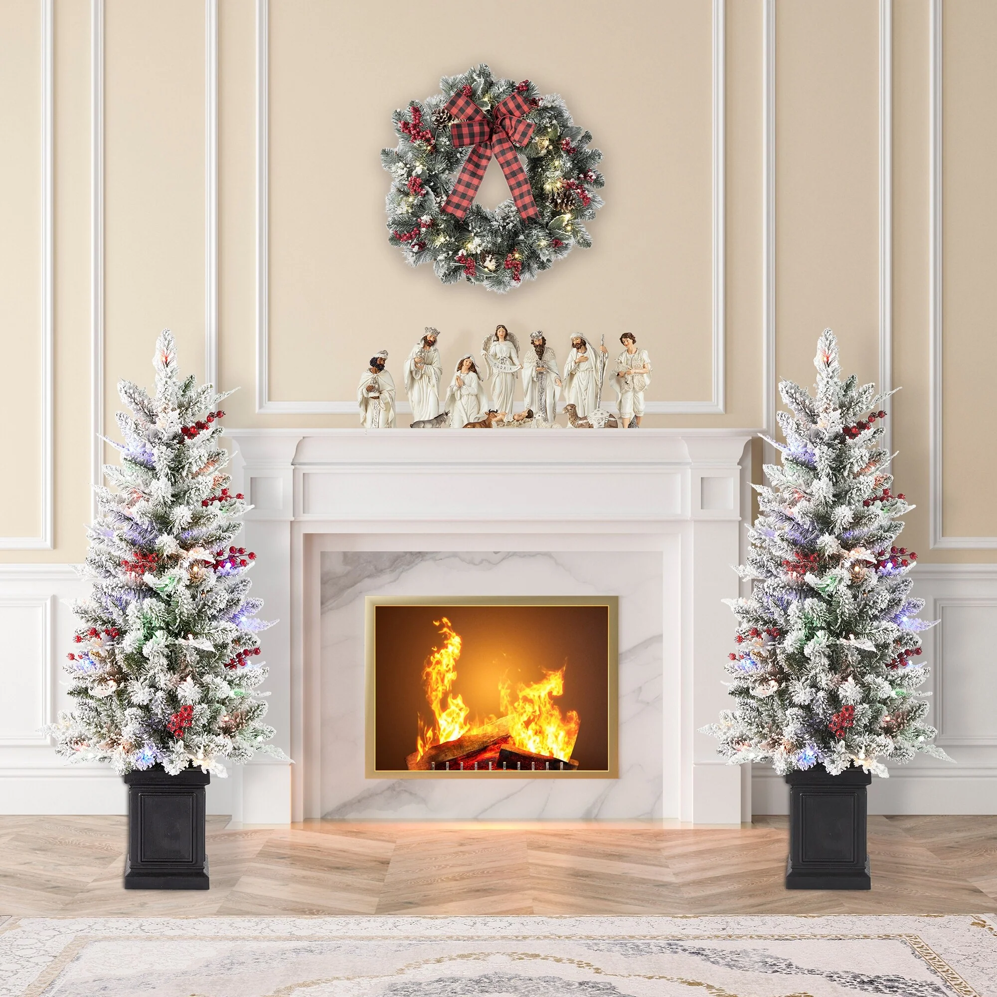 4-Piece Christmas Tree Set with Fiber Optic Lights, Wreath, Garland, and 2 Entrance Trees, Colorful LED Lights