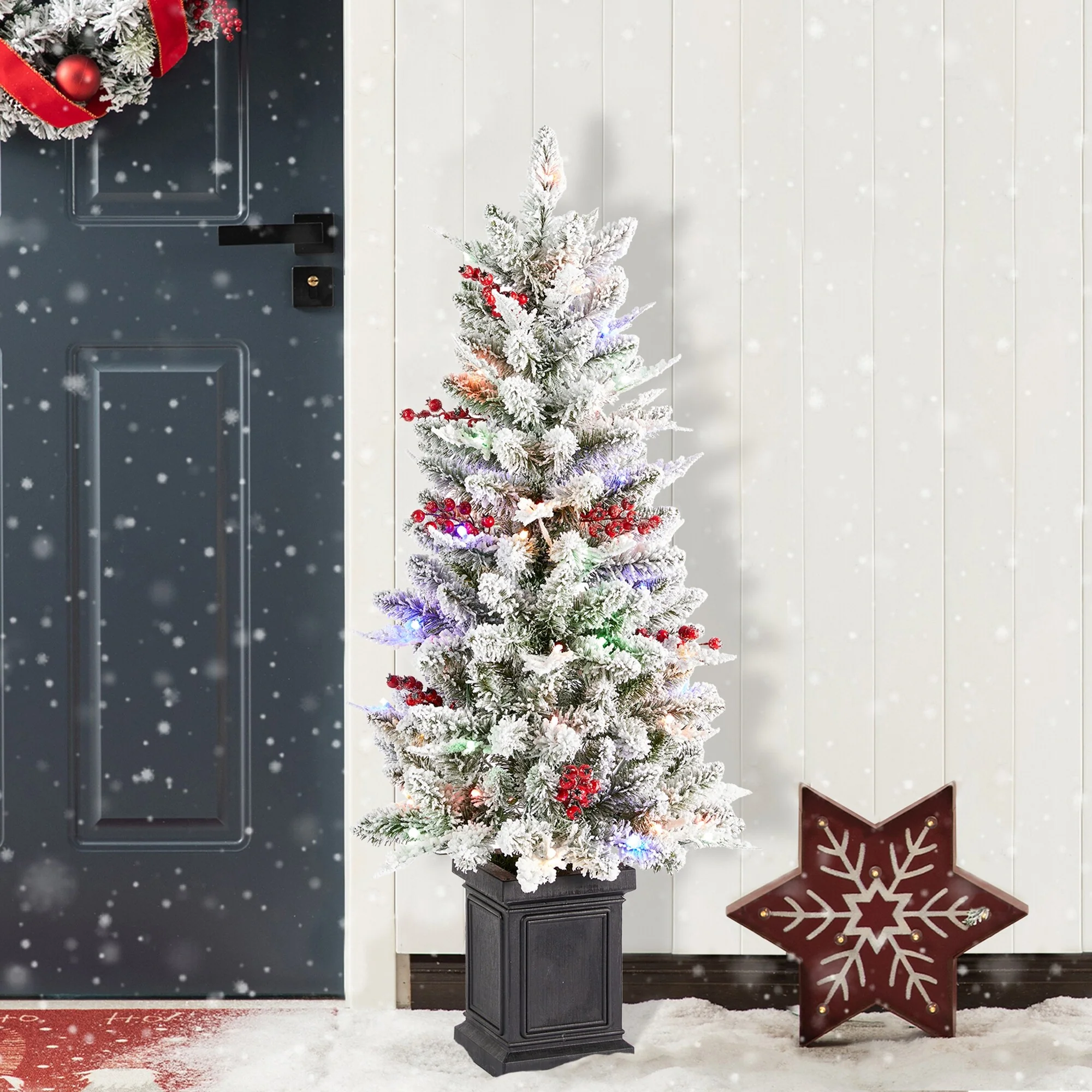 Glitzhome 4ft Pre-Lit Flocked Artificial Christmas Porch Tree with and Red Berries and 60 Warm White/Multi-color Lights