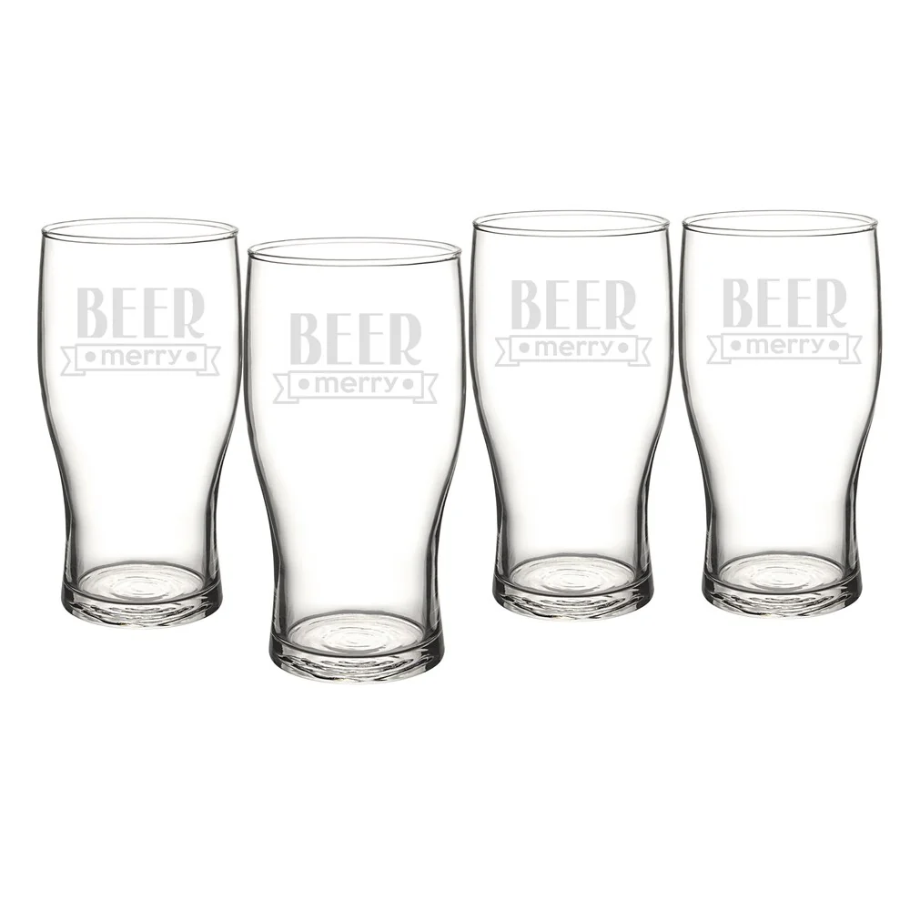 Celebrate the holidays with your favorite winter brew in our Beer Merry Pilsner Glasses. A unique contoured shape enhances flavors and aromas, making this the perfect beer glass for your entertaining collection. Serve up pale ales, stouts, or lagers at your next gathering or give as a great holiday gift. Available as shown only. Quantity: Sold in a set of four (4). Dimensions: 6.25. L. with a 3.125. W. diameter (at top) and a 2.75. W. diameter (at bottom). Holds up to 19 oz. Features: Glass crafted into the classic pilsner shape, sturdy heavy-weighted bottoms, and a beer merry design. Materials: Clear glass. Please Note: minor bubbles and swirls are inherent to hand-blown glass. Variations may occur on styles due to their handcrafted nature. Care Instructions: Dishwasher safe. Engraving Options: Available as shown only.