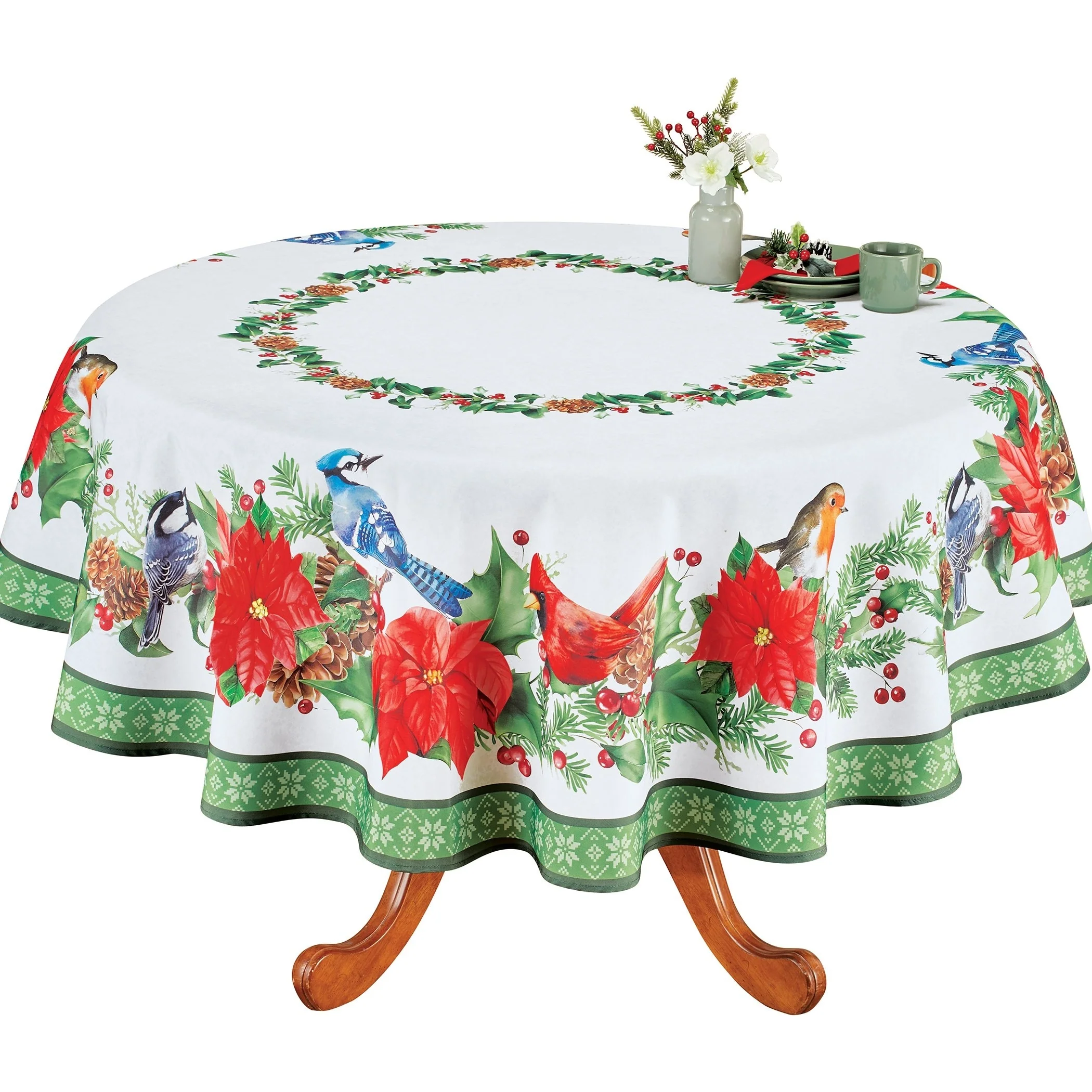 A beautiful design and festive colors make these printed tablecloths the perfect way to dress up your table for the holidays. The colorful linens feature bright red poinsettias, pine branches, holly and songbirds on a white background with a green snowflake border. Available in two sizes. Machine wash. Polyester; imported. Choose: Round (70"Dia.) or Rectangle (90"L x 60"W).