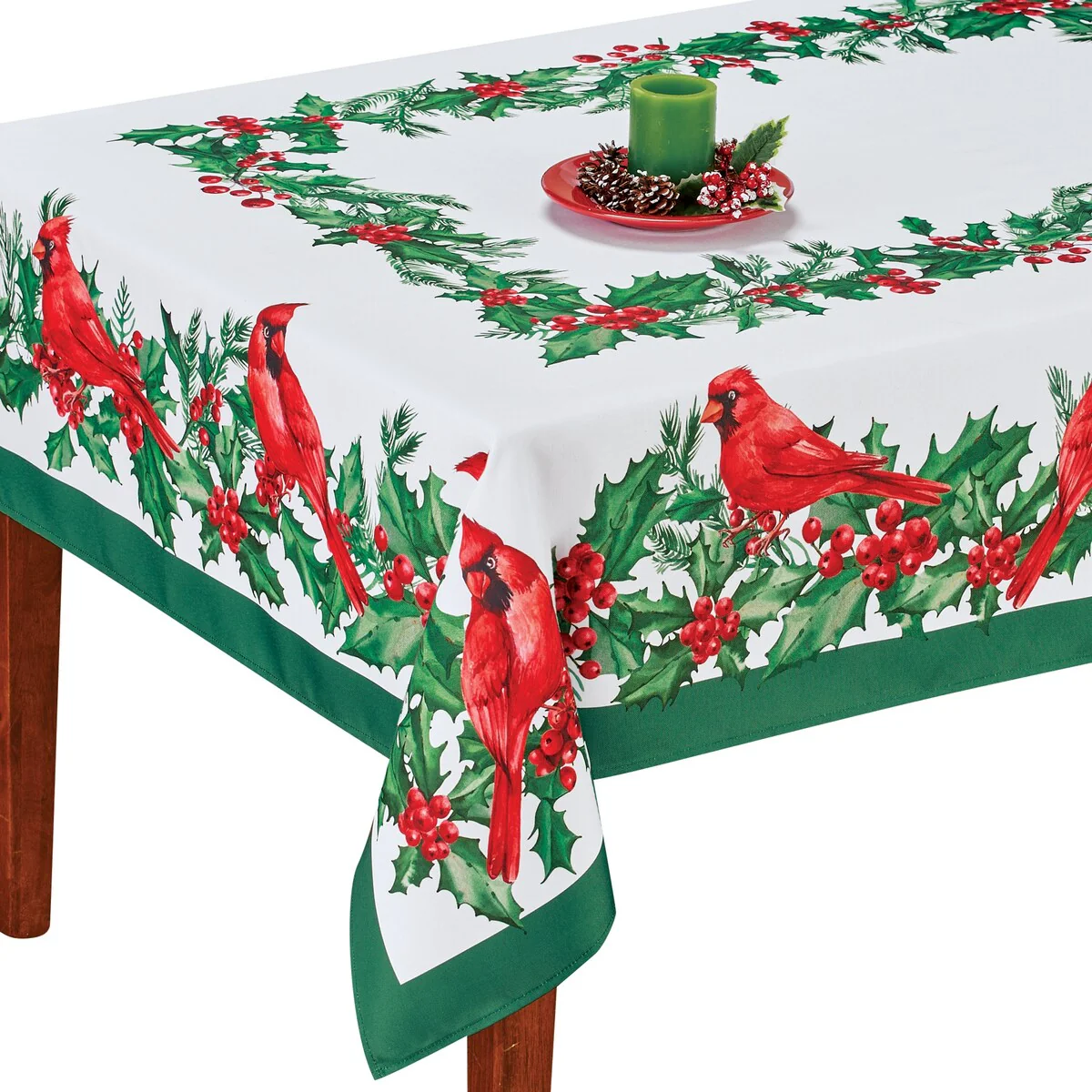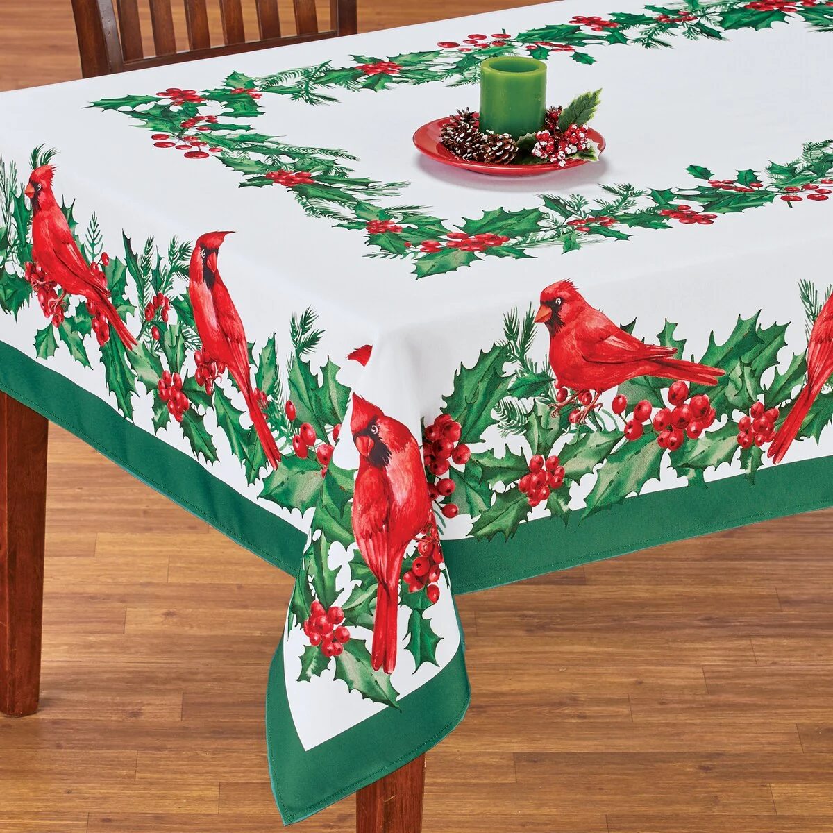 Beautiful colors and a lovely design make these printed tablecloths the perfect way to dress up your table for the holiday season. The snow white linens feature garlands of holly with bright red cardinals perched on top. The table linens are finished with a green border. Machine wash. Polyester; imported. Choose: Round (70"Dia.) or Rectangle (91"L x 60"W).