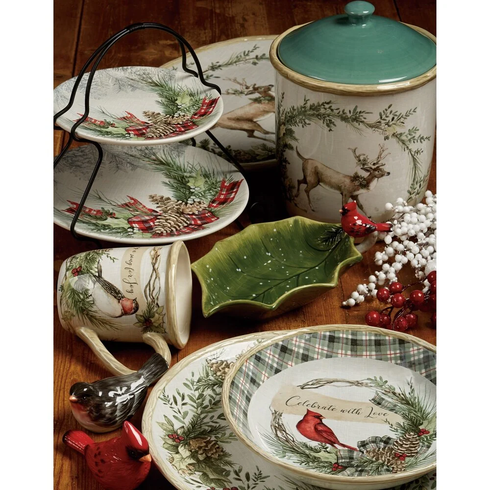 Bring the charm of a winter wonderland to your dining table with the Certified International Holly and Ivy 16-piece Dinnerware Set designed by Susan Winget. The ceramic collection is adorned with colorful birds, deer, and pine cones, and features heartfelt sentiments that perfectly complement the plaid design and embossed white birch rims. Durable earthenware construction makes this set perfect for everyday use or holiday entertaining.