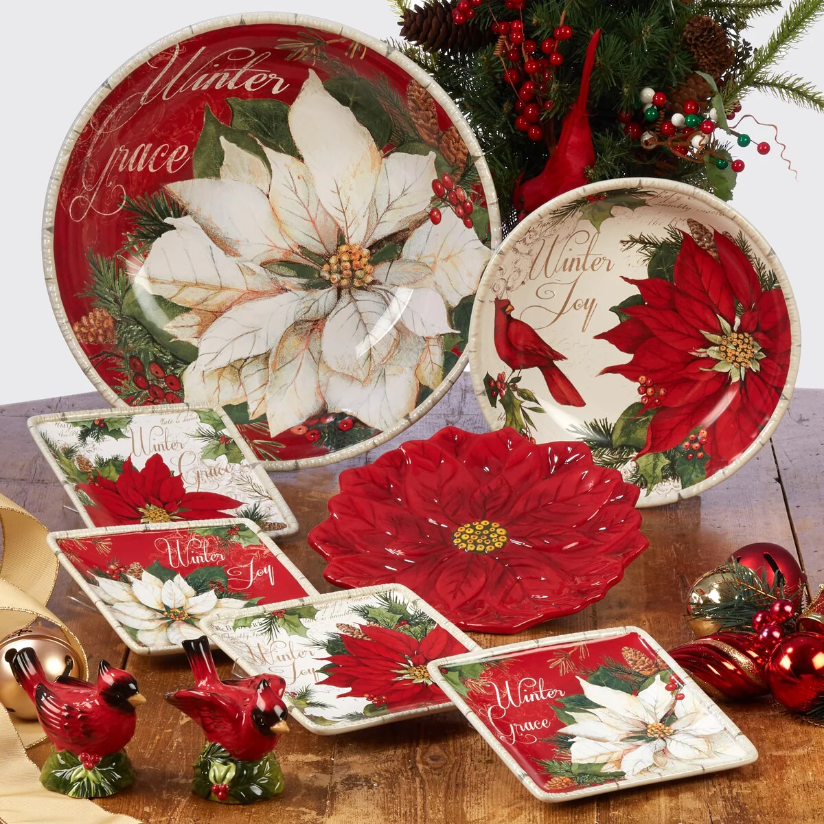 Beautiful red and white poinsettias decorate the "Winter Garden" ceramic dinnerware and serveware collection from Certified International. Embossed hand painted white birch rims surround each image with inspiring sayings as designed by Susan Winget. This elegant holiday collection is complemented by our 3-d ceramic assorted cardinal and poinsettia dessert plates and a cardinal S&P set.