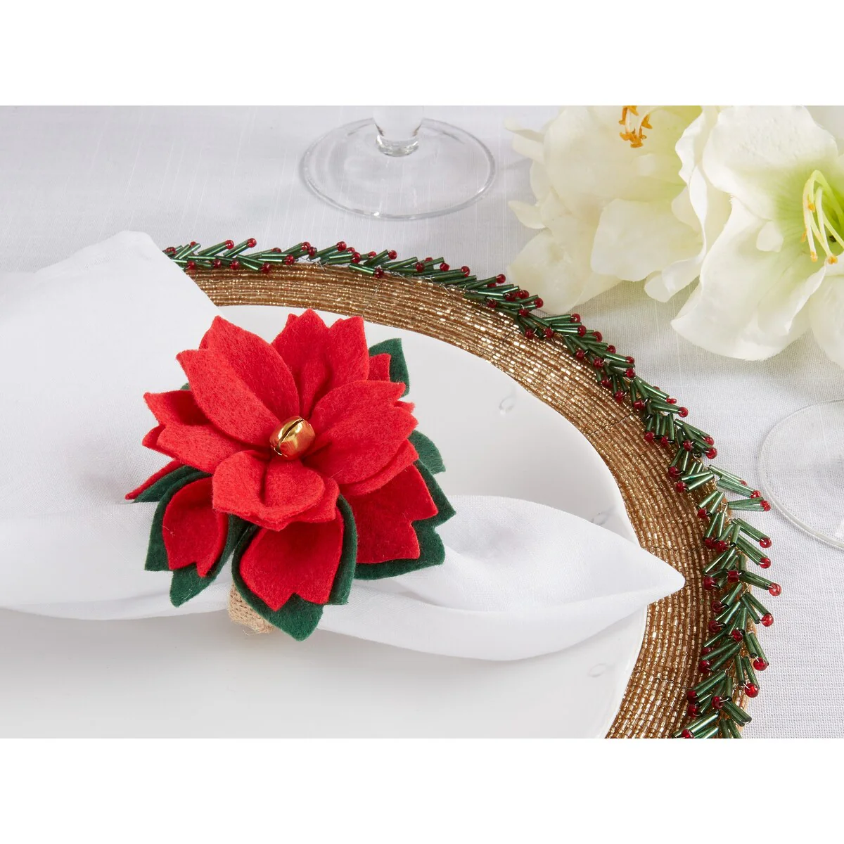 Bring the holiday spirit to your table setting with this set of Festive Felt Poinsettia Napkin Rings. The adorable poinsettia design adds a touch of charm and joy to your holiday celebrations. Made from high-quality felt material, these napkin rings are perfect for adding a pop of color and texture to your table setting. Ideal for Christmas dinner or any festive gathering, these napkin rings are a must-have accessory for the holiday season.