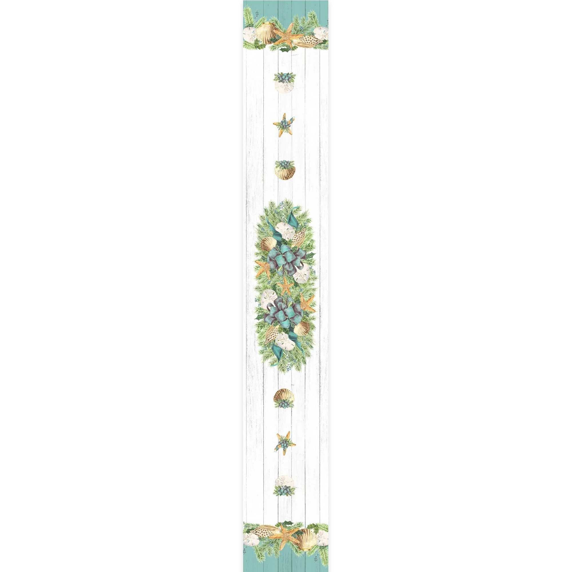 This soft to the touch "Christmas By The Sea" runner is an excellent way to add coastal flair to your Christmas table setting. Christmas by the sea features soft yet bold blue hues. Shiplap flairs & sea shells hang like with garland elegantly bringing the true feeling of Christmas by the sea.