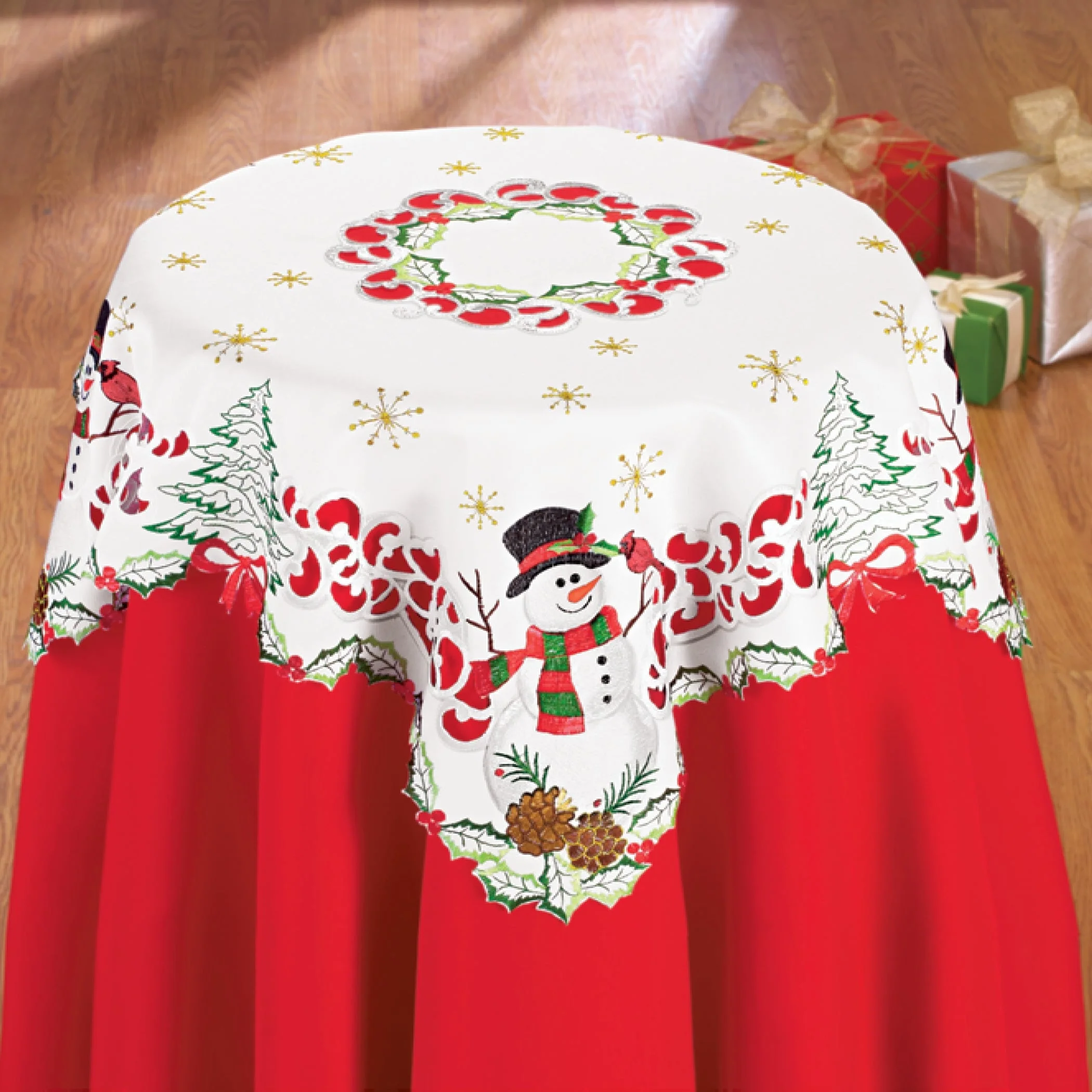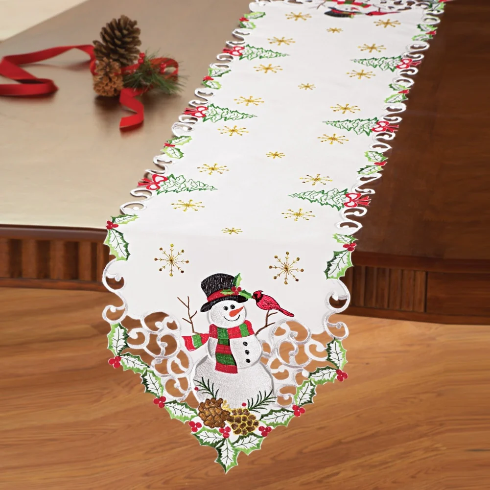Charming snowman design includes holly leaves and berries, pinecones, trees and sparkling gold snowflakes. These linens feature exquisite embroidery, lacy openwork and delightful details. Perfect on their own or with a coordinating tablecloth underneath (sold separately). Machine wash. Polyester; imported. Available either as a Runner (68" x 13"), or a Square (34"Sq.).