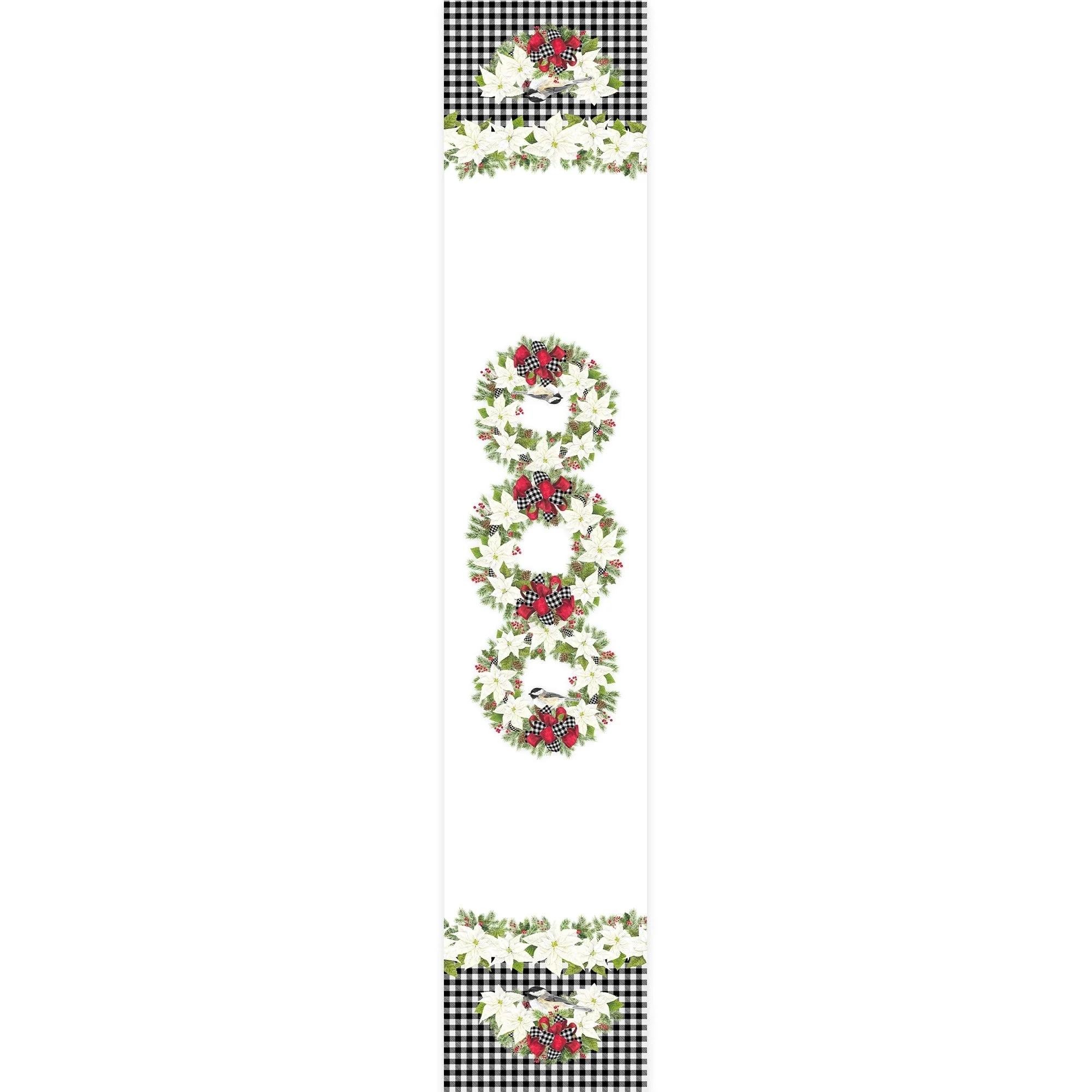 This soft to the touch "Christmas Trimmings" runner is the perfect compliment to all your holiday decorations. Bringing holiday cheer with white poinsettias, beautiful bows, green garlands and cute chickadees. Three beautiful wreaths lie in the center of this elegant runner creating the perfect accent to your holiday table.