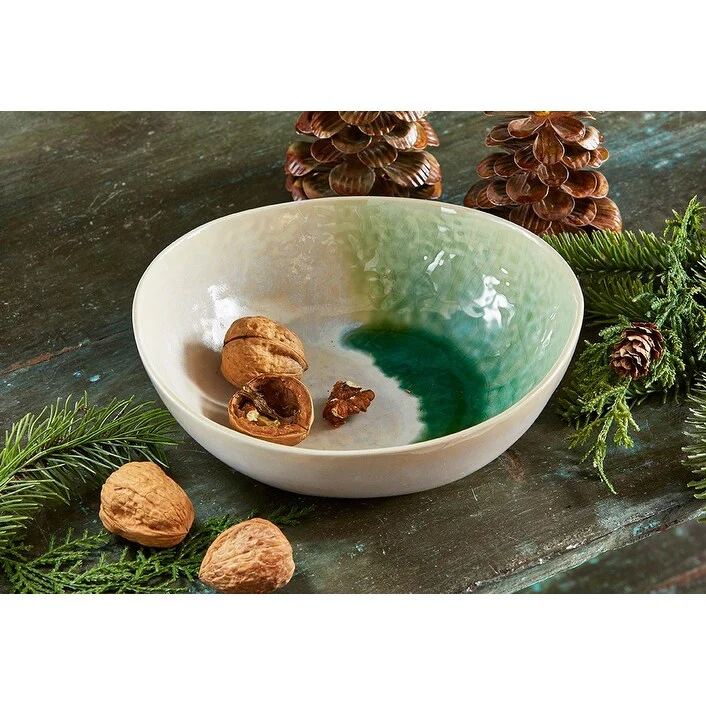Beautiful on any surface, this porcelain bowl features a two-tone reactive glaze finish with a crackle exterior.