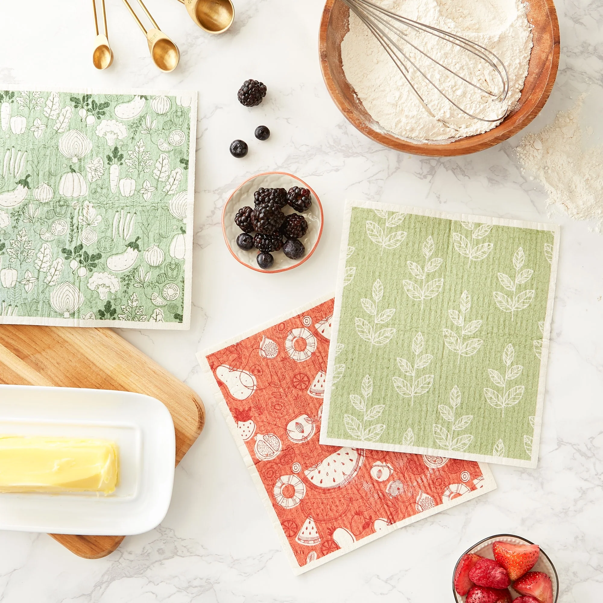 These stylish 100% cellulose (natural fiber) Swedish dishcloths are perfect for your kitchen, bath and home. Tired of going through your sponges, paper towels and ordinary dish cloths way too fast? These colorful dishcloths absorb about 15 times their weight in water and would be perfect to tackle any cleaning job. They soften when wet and wash and dry any spot in a blink of an eye. Attractive patterns are printed in water based ink.