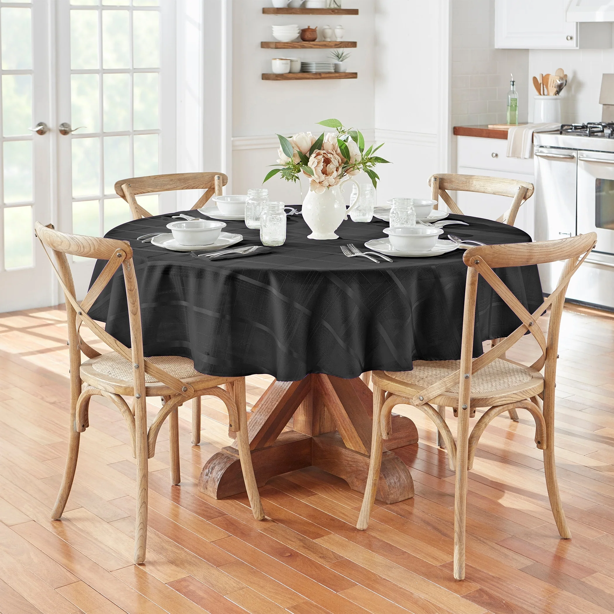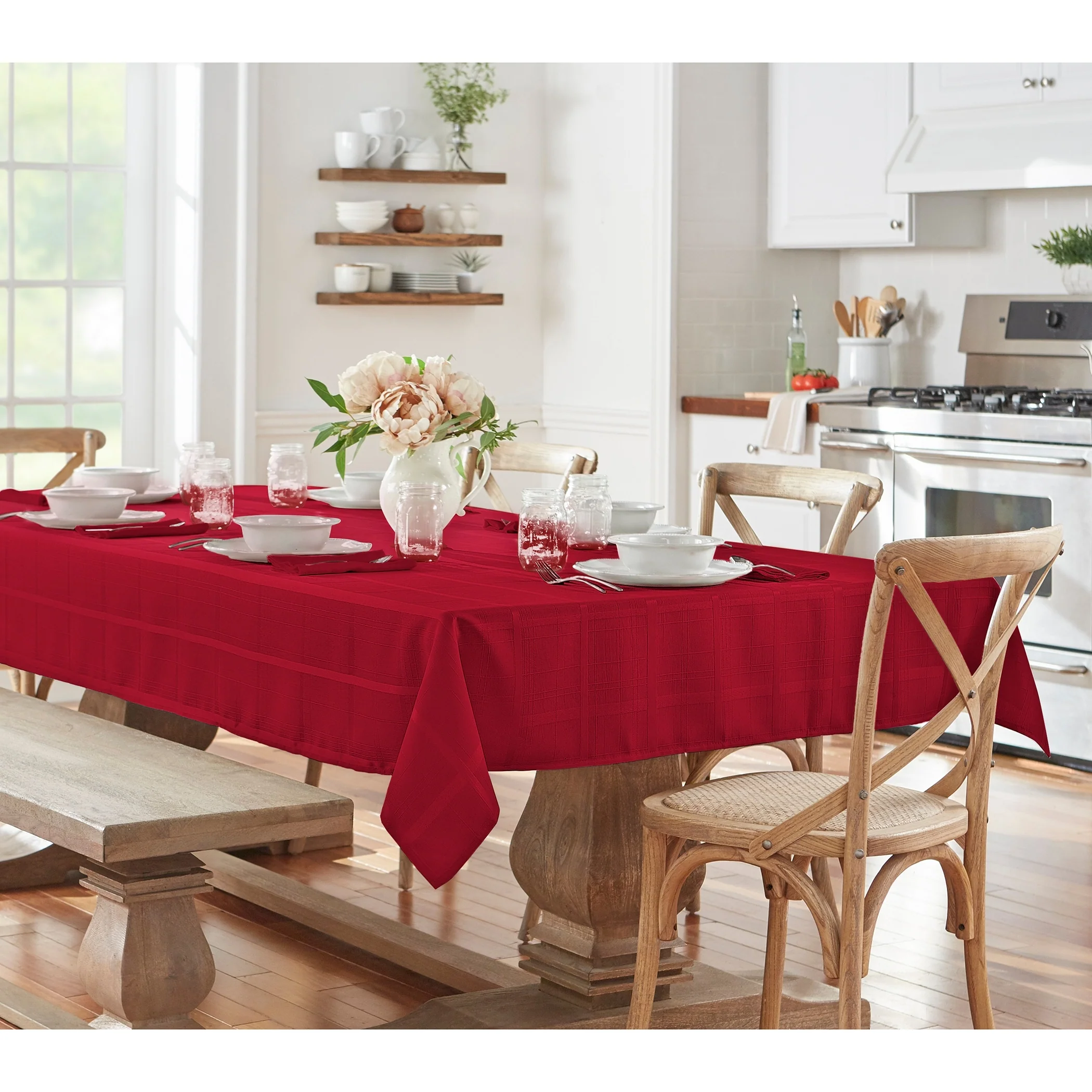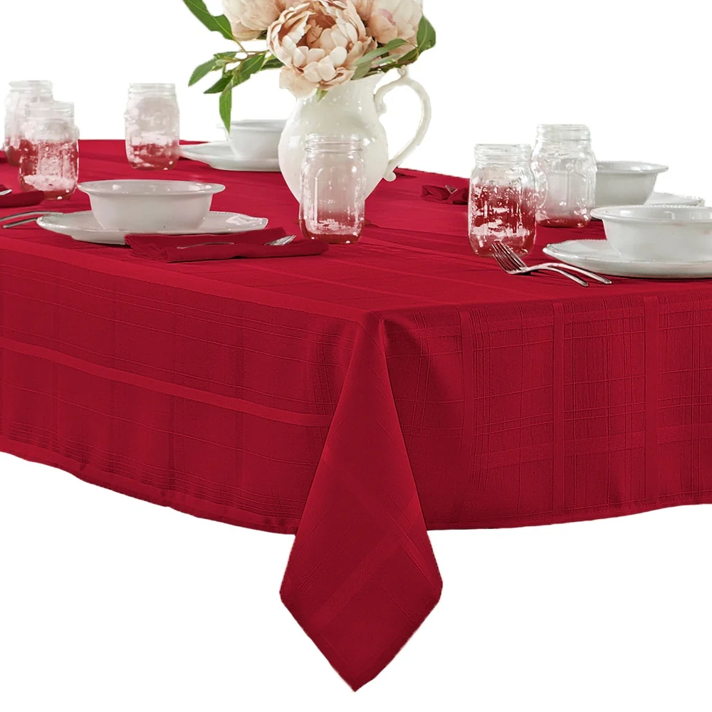 Add a touch of sophistication to your dining table with our Elegance Plaid Jacquard Woven Tablecloth. Made of polyester with a delicate jacquard weave, this tablecloth not only protects your table but also adds a stylish and refined look to your dining setup. Choose from a variety of color options to complement your decor. Easy to care for, this tablecloth is machine-washable and iron-safe for wrinkle-free use.
