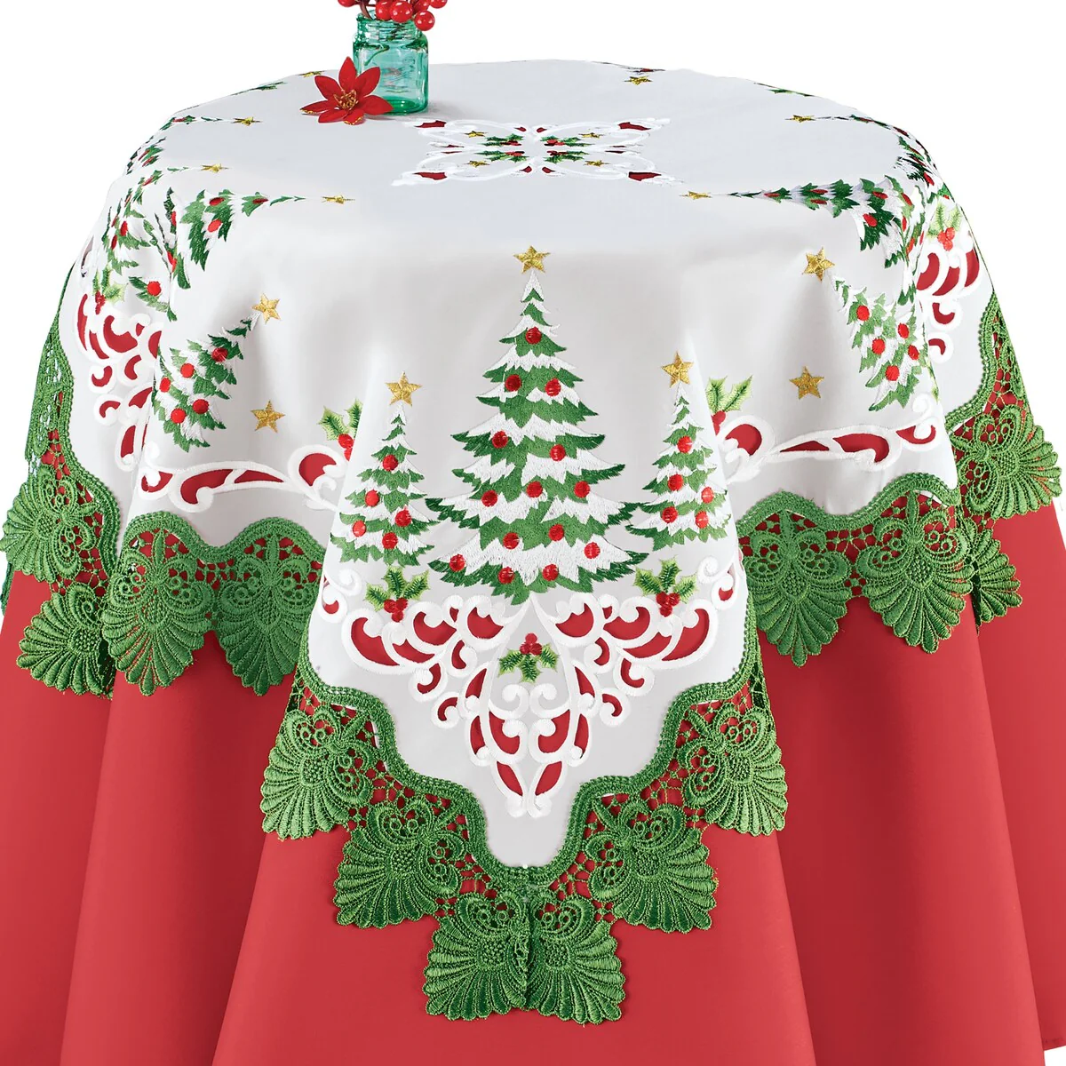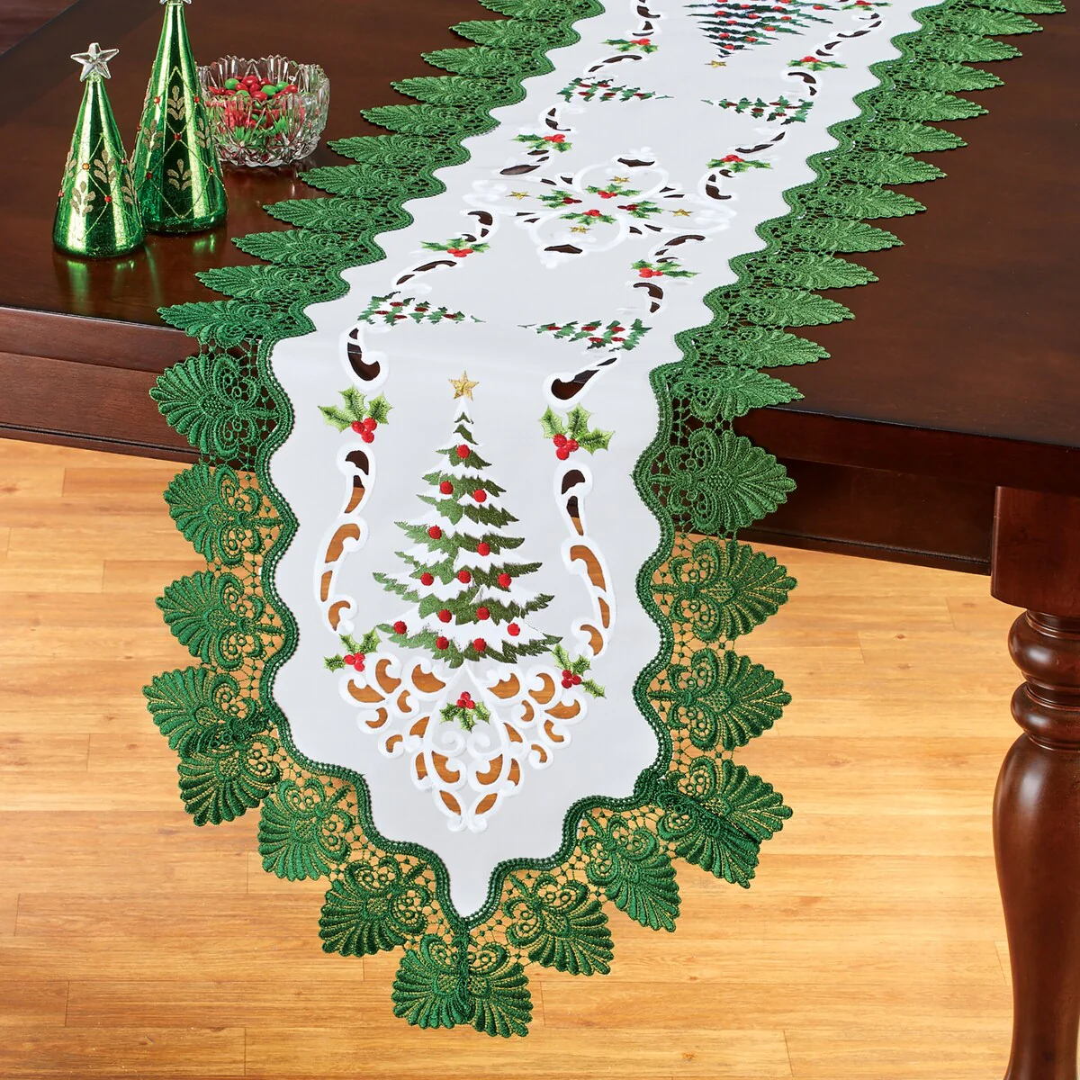 The embroidery and charming design of these festive table toppers makes it easy to dress your holiday tables in style. Featuring decorated Christmas trees, holly leaves and berries, and intricate cut work, these linens are finished with beautiful green lace at the edges. Machine wash. Polyester; imported. Choose: Runner (68 1/2"L x 18 3/8"W) or Square (35"Sq.)