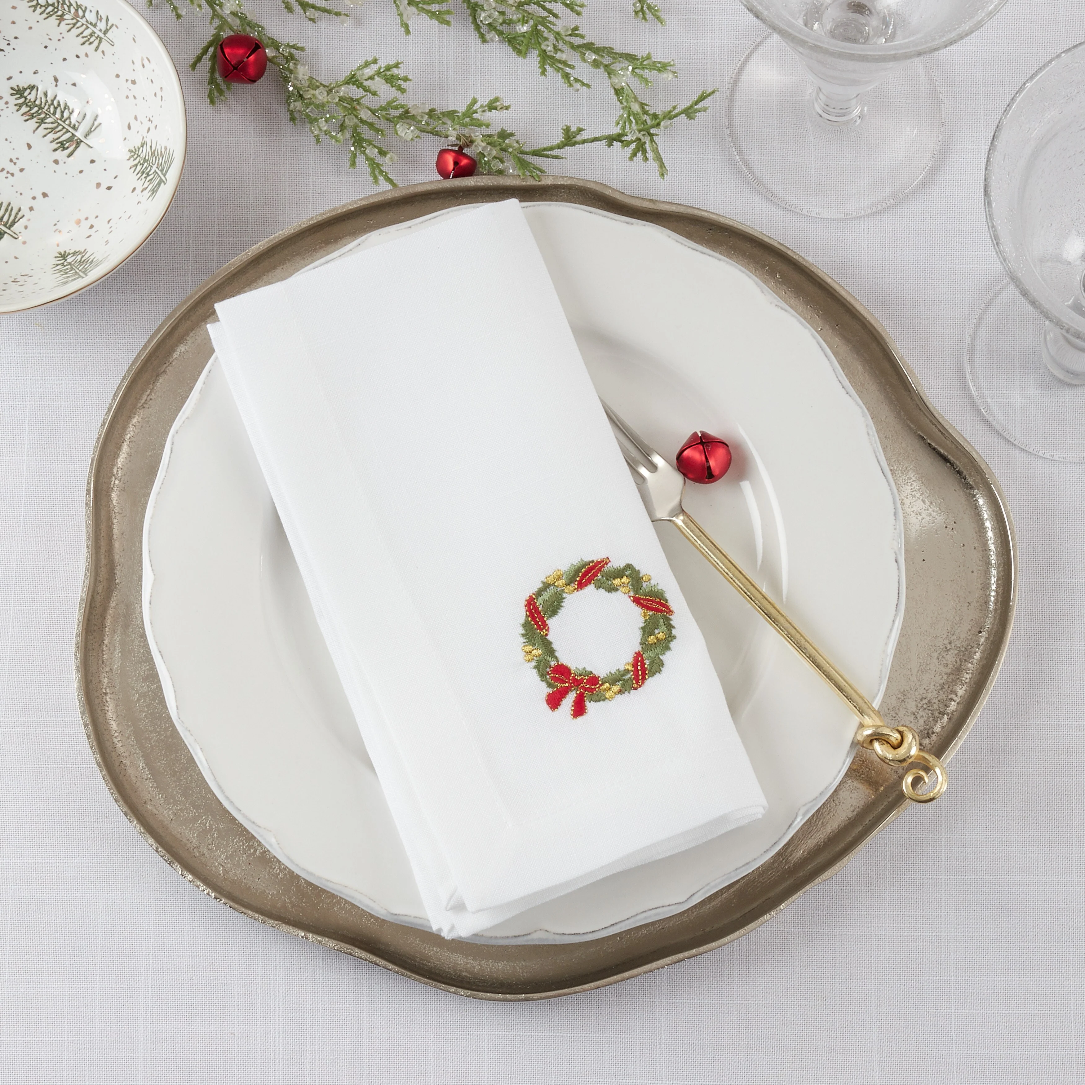 Elevate the look of your table setting with this jazzy, timeless set of Wreath Design Embroidered Table Napkins. Featuring traditional Christmas colors in rich tones, these table napkins are perfect for the holiday season and will brighten up your space. Pair the set with other holiday-inspired table linens and décor.