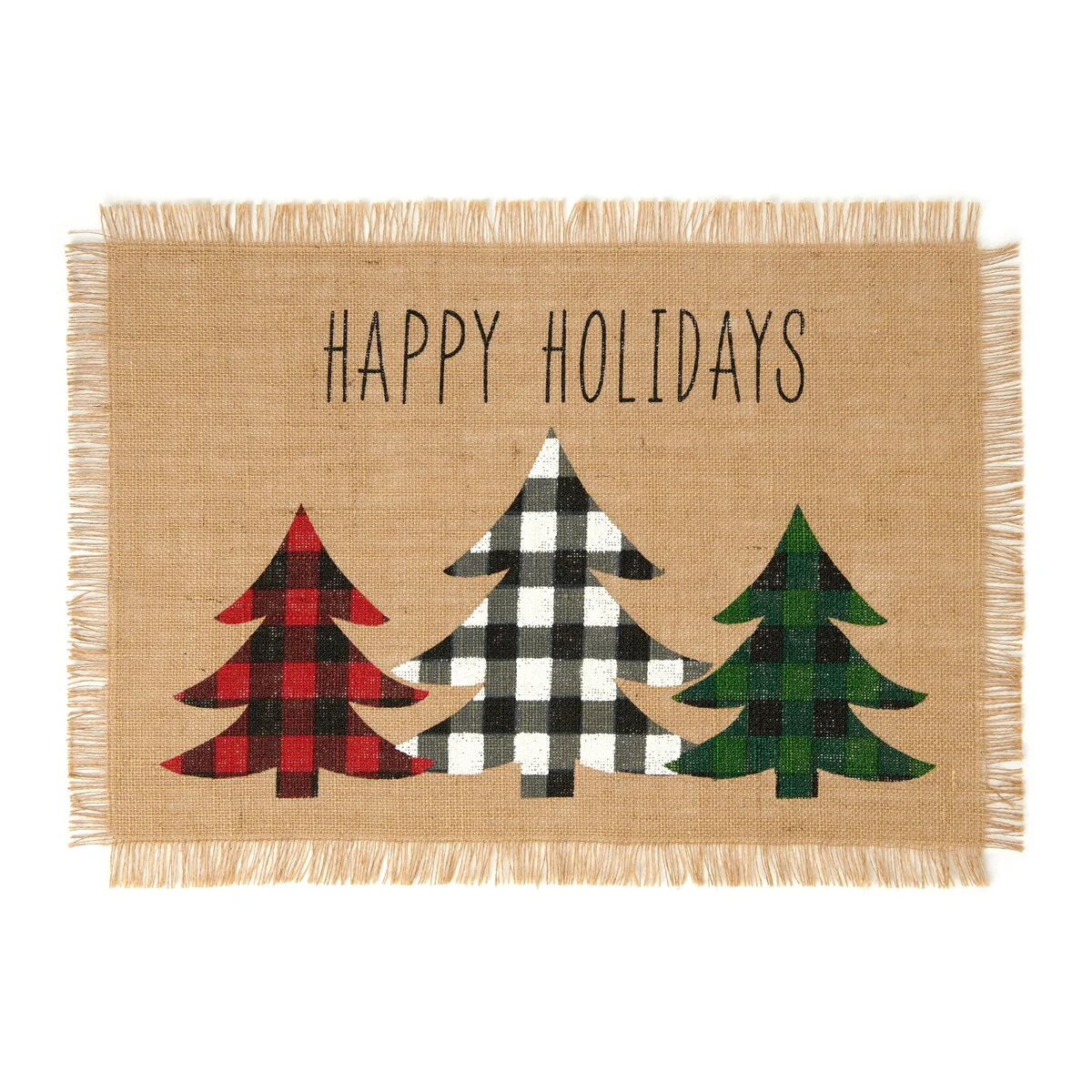 These holiday inspired natural woven burlap placemats are made from premium quality fabrications and feature an adorable holiday print with Christmas trees in red/black, white/black, green/black plaid checkered design and traditional "Happy Holidays" phrase. Excellent for special occasions, events, parties, hostess gifts and everyday d茅cor use during the holiday season. Burlap placemat features a fringed edge, adding style and a rustic feel. Sold as a set of four placemats measuring 13x19 each. Coordinate to all the items in our Farmhouse Living Holiday Plaid collection featuring tablecloths, napkins, table runners and coir door mats. 100% Burlap. Spot clean only.