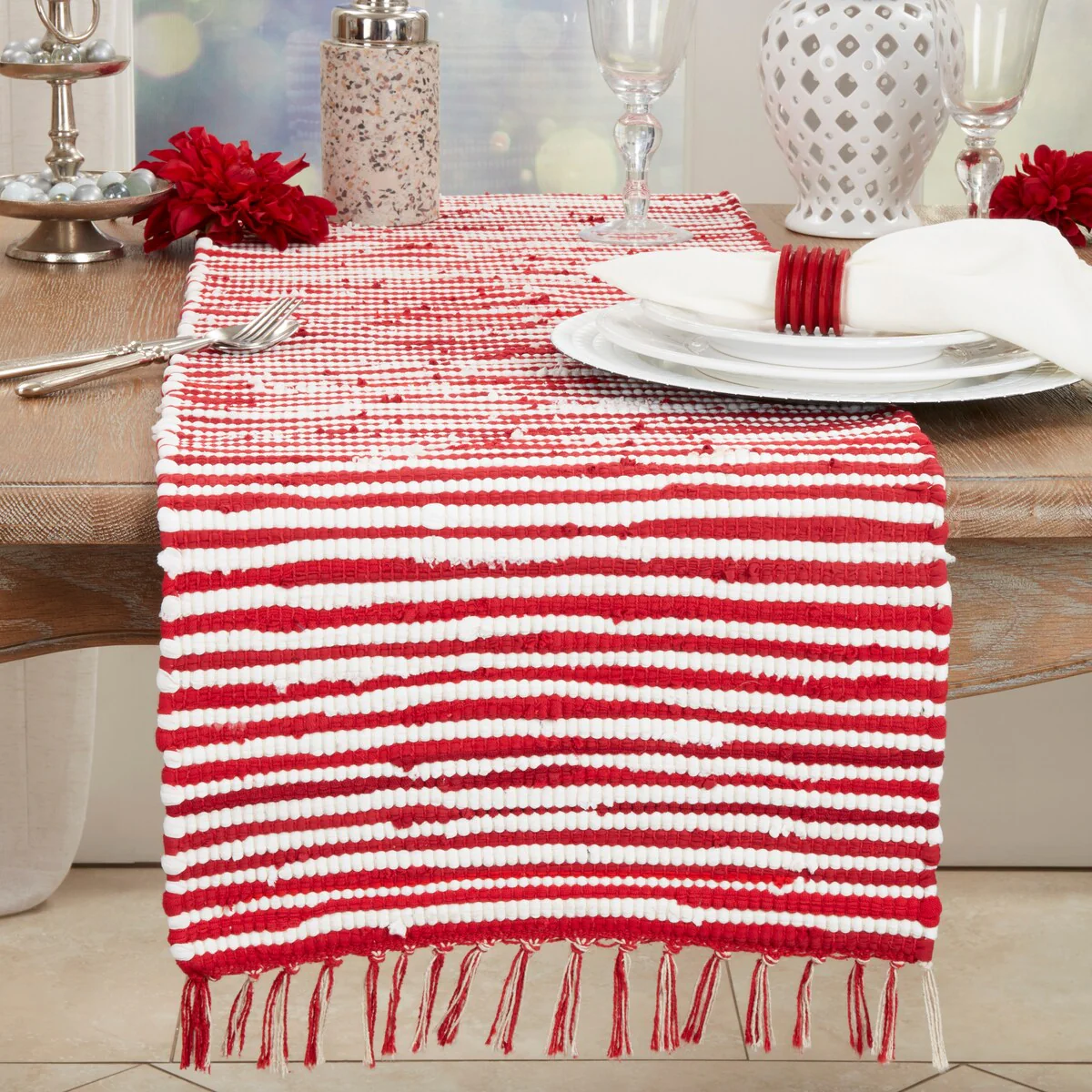 Introducing the Festive Candy Cane Chindi Table Runner, a delightful accent to add holiday charm to your dining decor. Carefully crafted, this runner features a cheerful array of candy cane-inspired stripes, woven with vibrant colors and intricate patterns. The chindi fabric adds a textural element, enhancing the festive appeal and bringing warmth to your table setting. Perfect for both casual gatherings and formal dinners, this runner infuses your space with whimsy and merriment, setting the stage for joyful celebrations with loved ones. Embrace the spirit of the season with the Festive Candy Cane Chindi Table Runner, a cherished centerpiece for your holiday festivities.