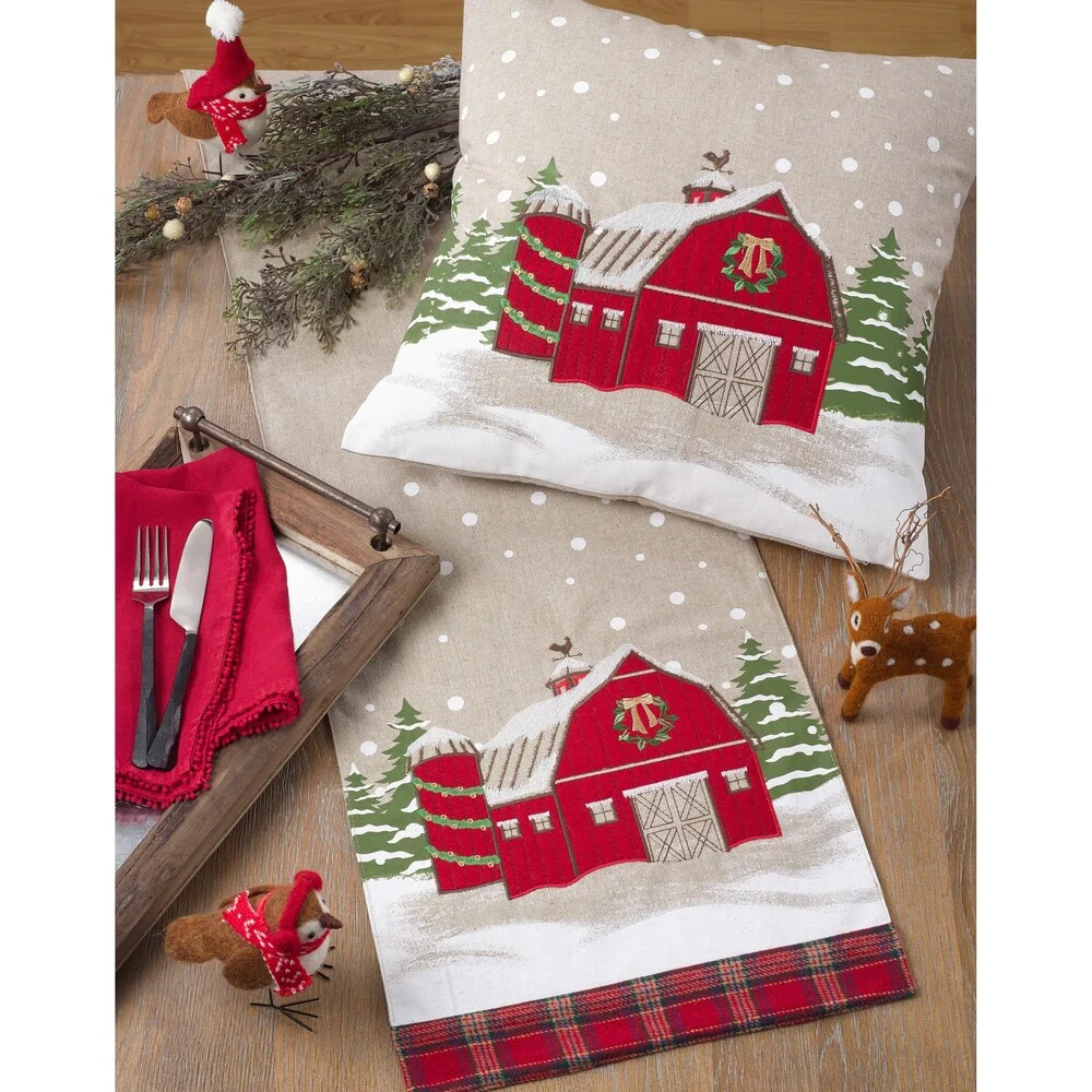 The barn in the snow design of this lovely table runner brings a classic touch to your dinner table. It's hard to resist the serene image and the softness that it illustrates. Coordinate with matching throw pillows and stockings for an integrated d茅cor.