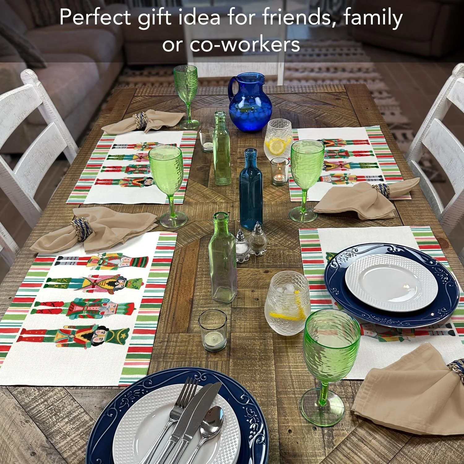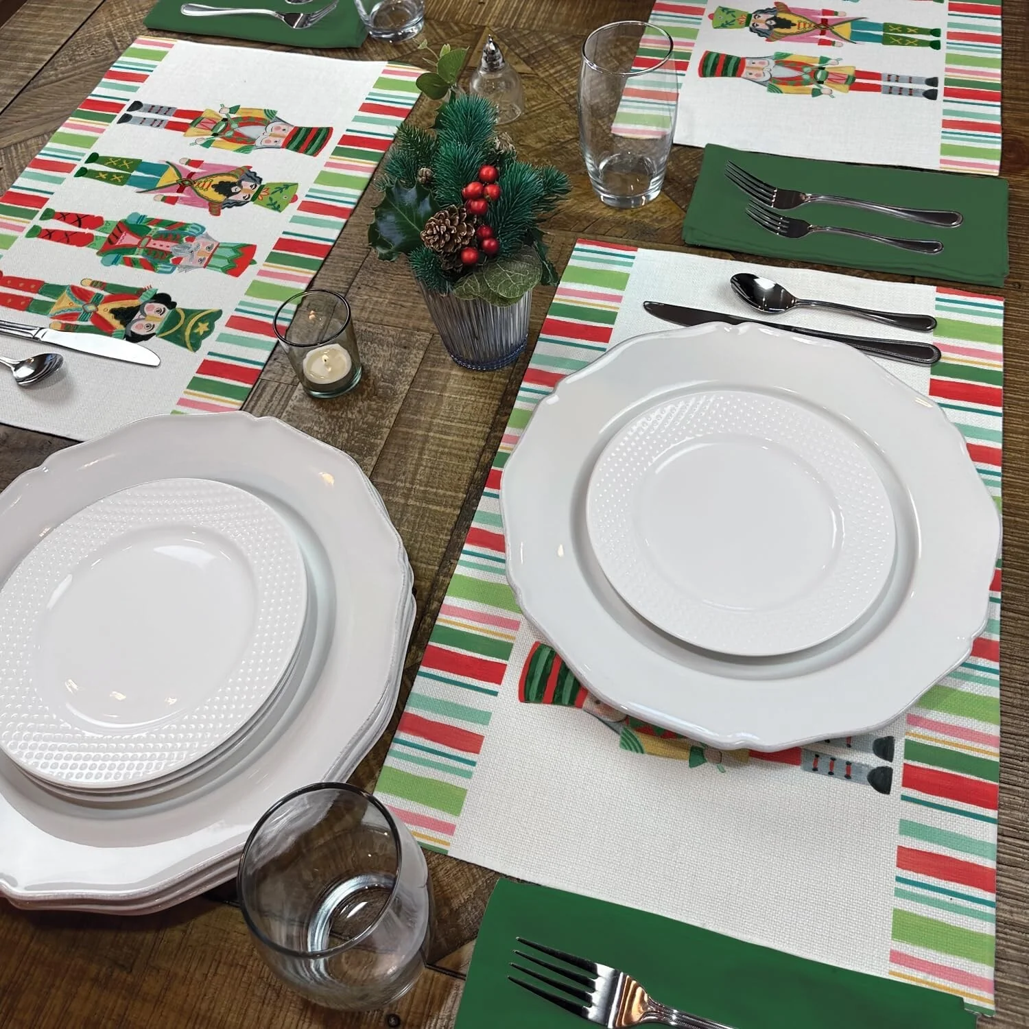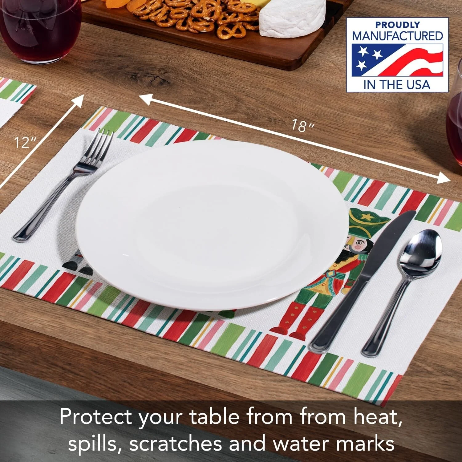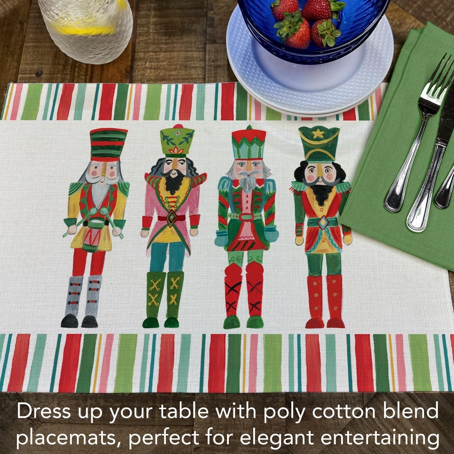 Highland Home Holiday Nutcracker Decorative 4 Pack Poly-Cotton Placemats. Each Placemat measures 18” x 12” and is rectangular in shape. Constructed of a Poly-Cotton Blend that is machine washable and dryer safe. Each placemat is printed with a beautiful design. Durable Poly-Cotton Blend can withstand daily use. Created to protect your surfaces from scratches and stains. Placemats are an easy way to change the look of your kitchen, dining room, or outdoor eating area. Packaged in sealed polybag.