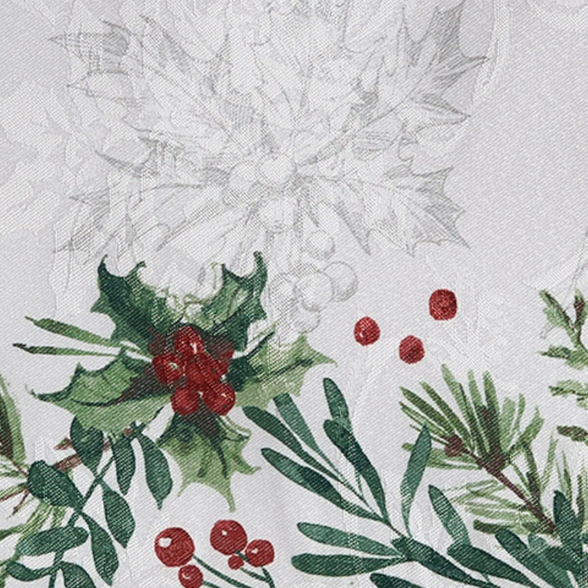 - Holiday Damask Design: Set against a sophisticated damask ground, these napkins feature a beautiful printed design of winter foliage, such as spruce pine cones and red holly berries.