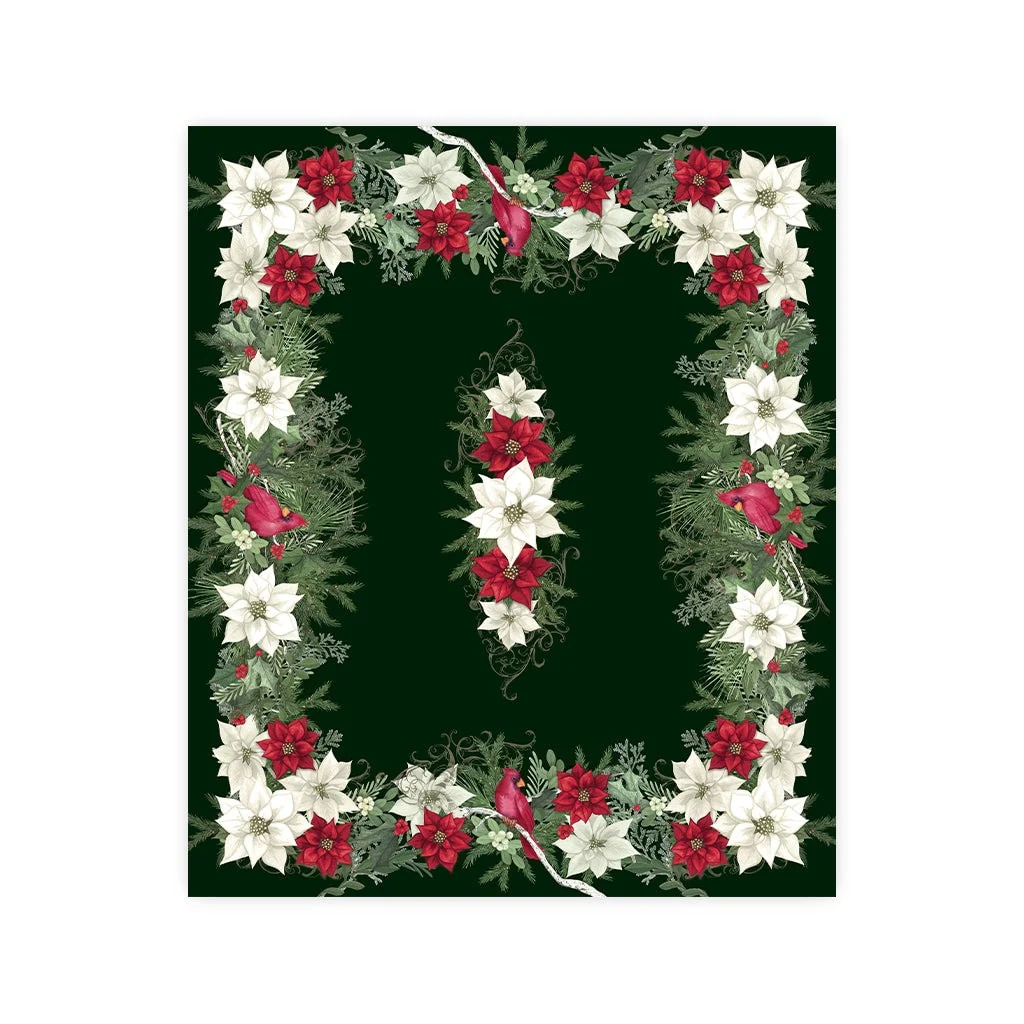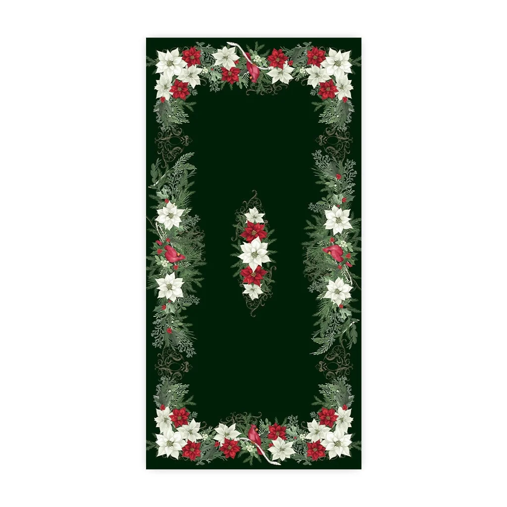 To many, the holidays are the most wonderful time of year. The "Christmas Elegance" tablecloth features bold cardinals surrounded by bright white and red poinsettias. Details of greenery and branches make the perfect nest on a dark green background. Make your home merry and bright with this classic tablecloth.