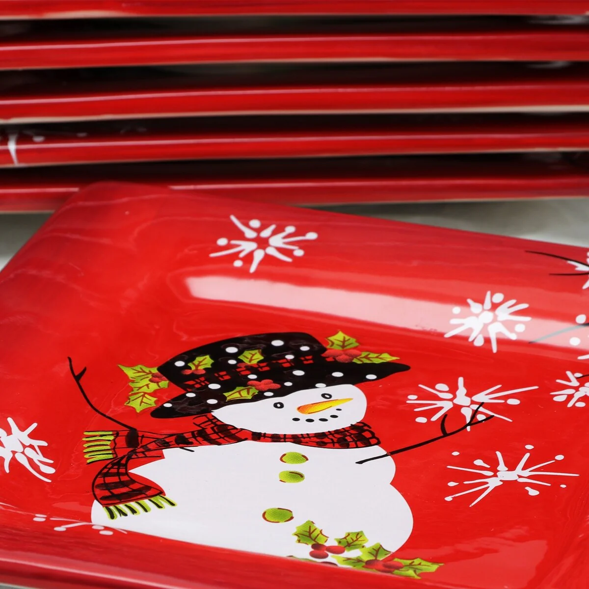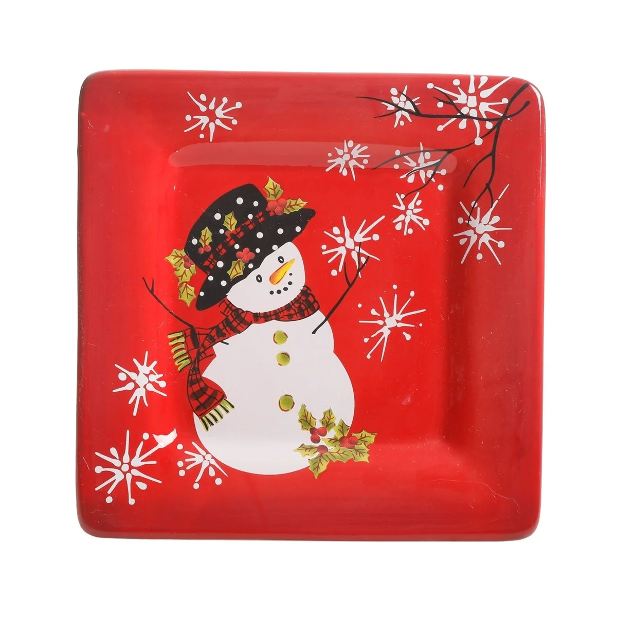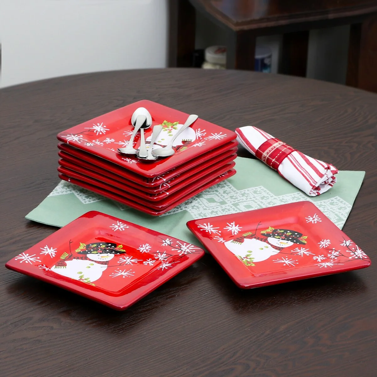 The Snappy Snowman 8-piece dessert plate set by Laurie Gates brings the coziness and happiness of the winter holidays right to your table. This beautifully crafted set features vibrant red and white colors, that are nicely complemented by a sleek reactive glaze finish. Each plates comes in a square silhouette with rounded corners to allow for generous portions.
