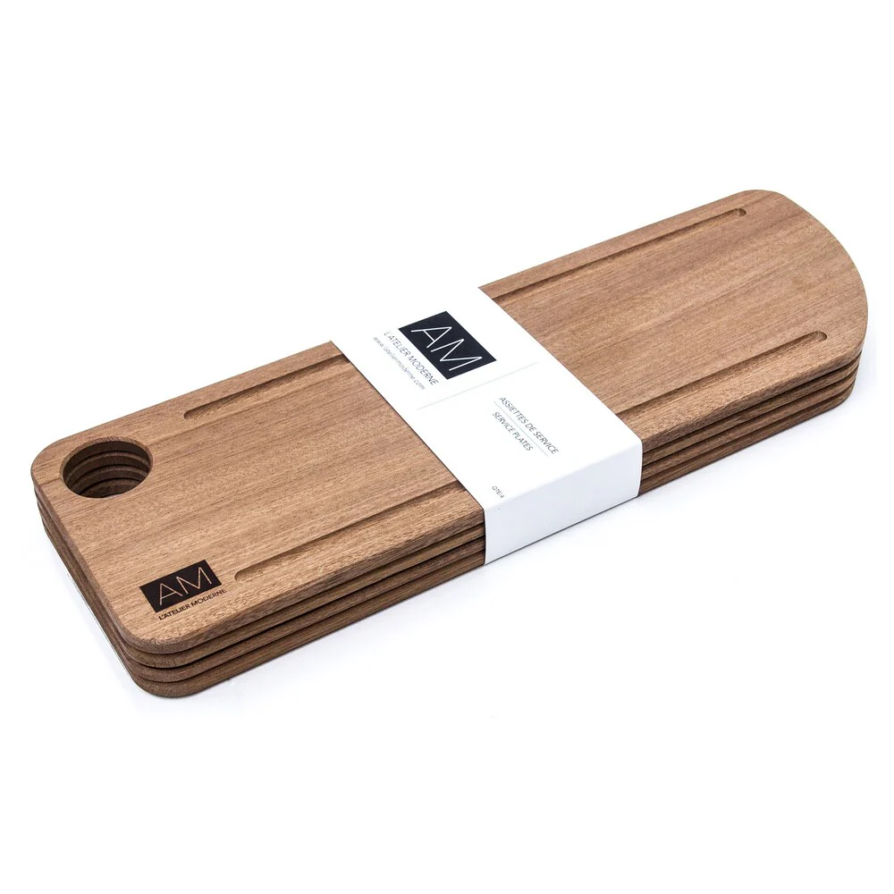 So we took the design of our artisanal 11x20 Mahogany Wood Cutting Board and made it available as 6x18 serving plates in sets of four.