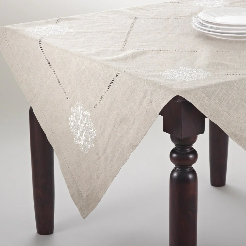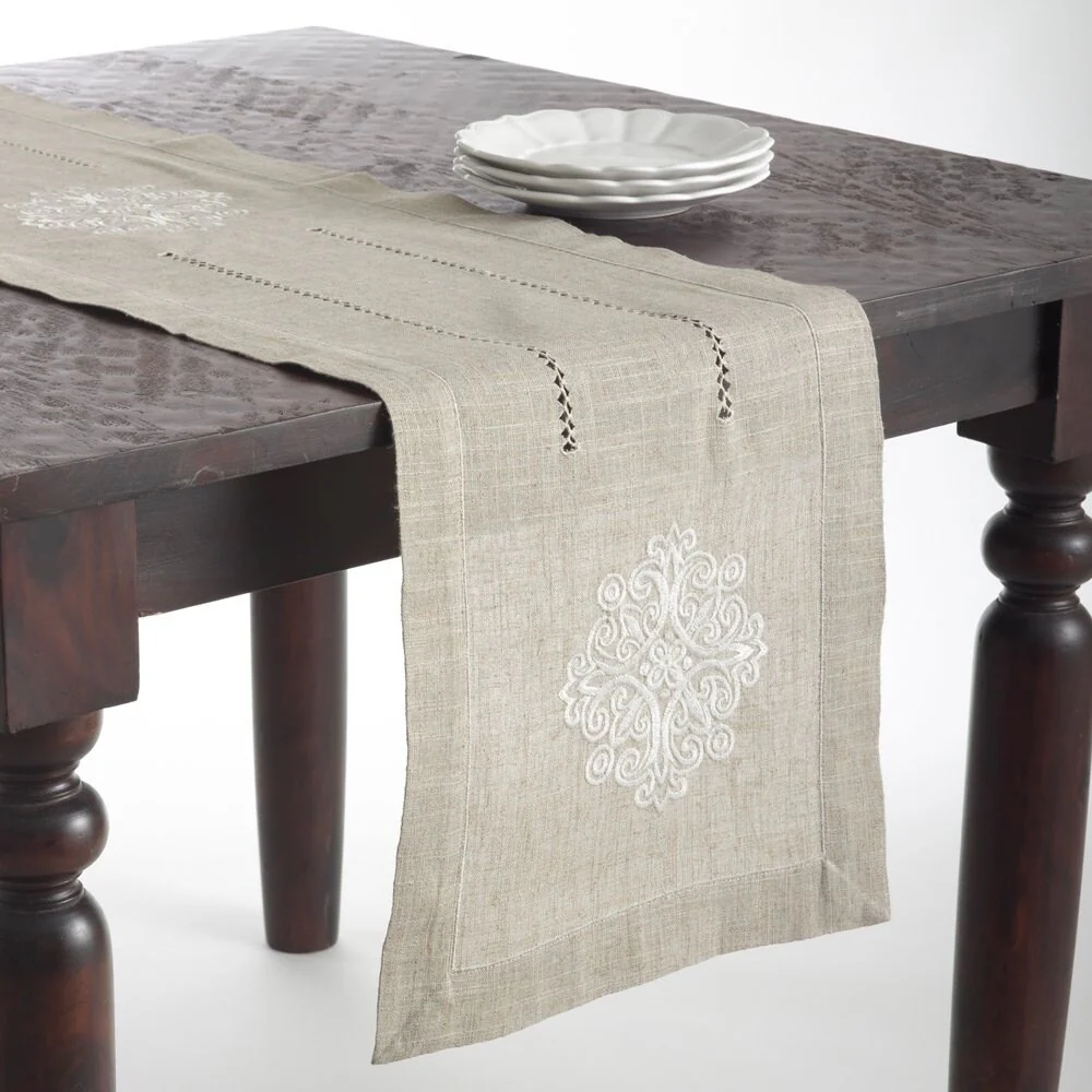This item provides the choice of an embroidered medallion design table runner or an embroidered medallion table topper for a unique table setting. Both items feature brilliant white embroidery on a natural background.