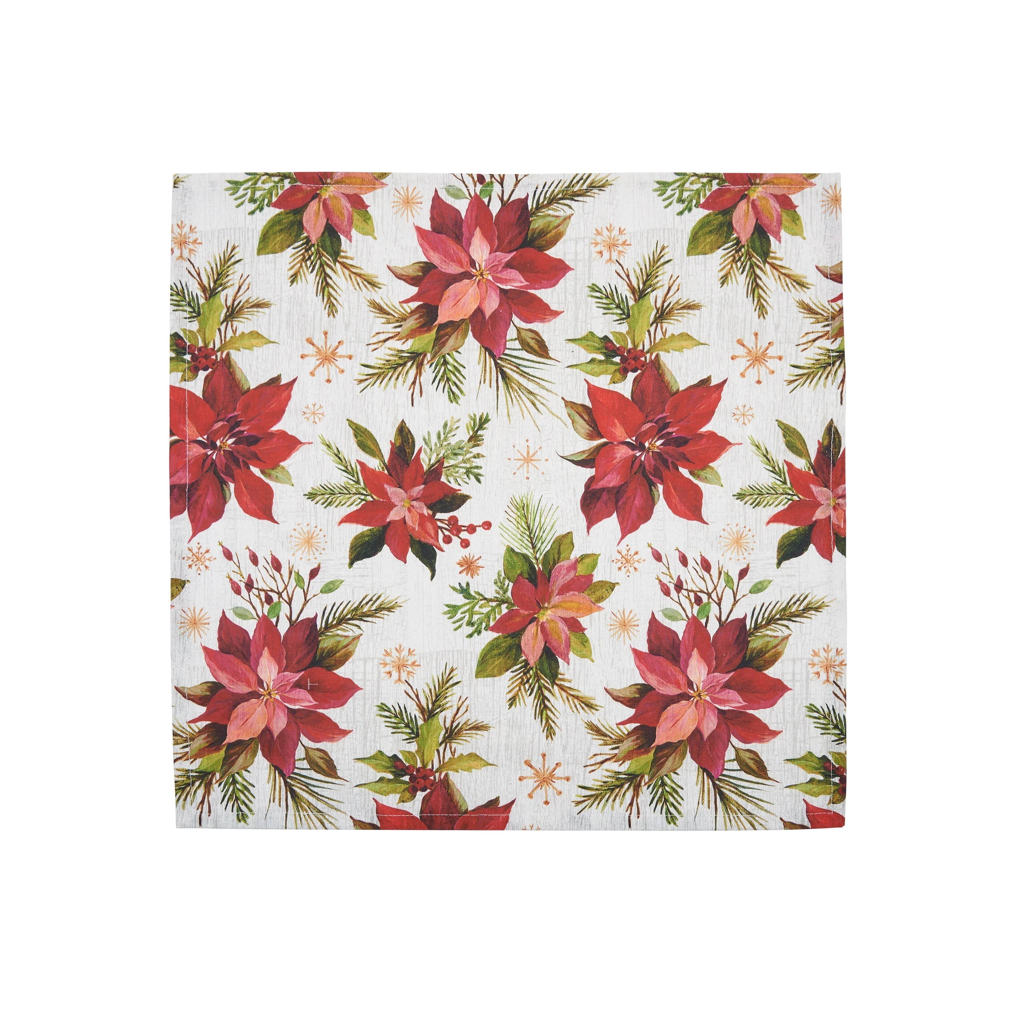 Add a special touch to your table setting with the Poinsettia Christmas Napkin Set. Made of 100 percent cotton, these napkins are not only stylish but also durable. With a set of 6 napkins, you can easily create a full table setting or a themed party. Perfect for any occasion, these napkins will take your existing dining room decor to the next level. They are easily washable, ensuring they can quickly return to the table for a warm meal. Get ready to impress your guests with this whimsical and fun napkin set from C&F Home.