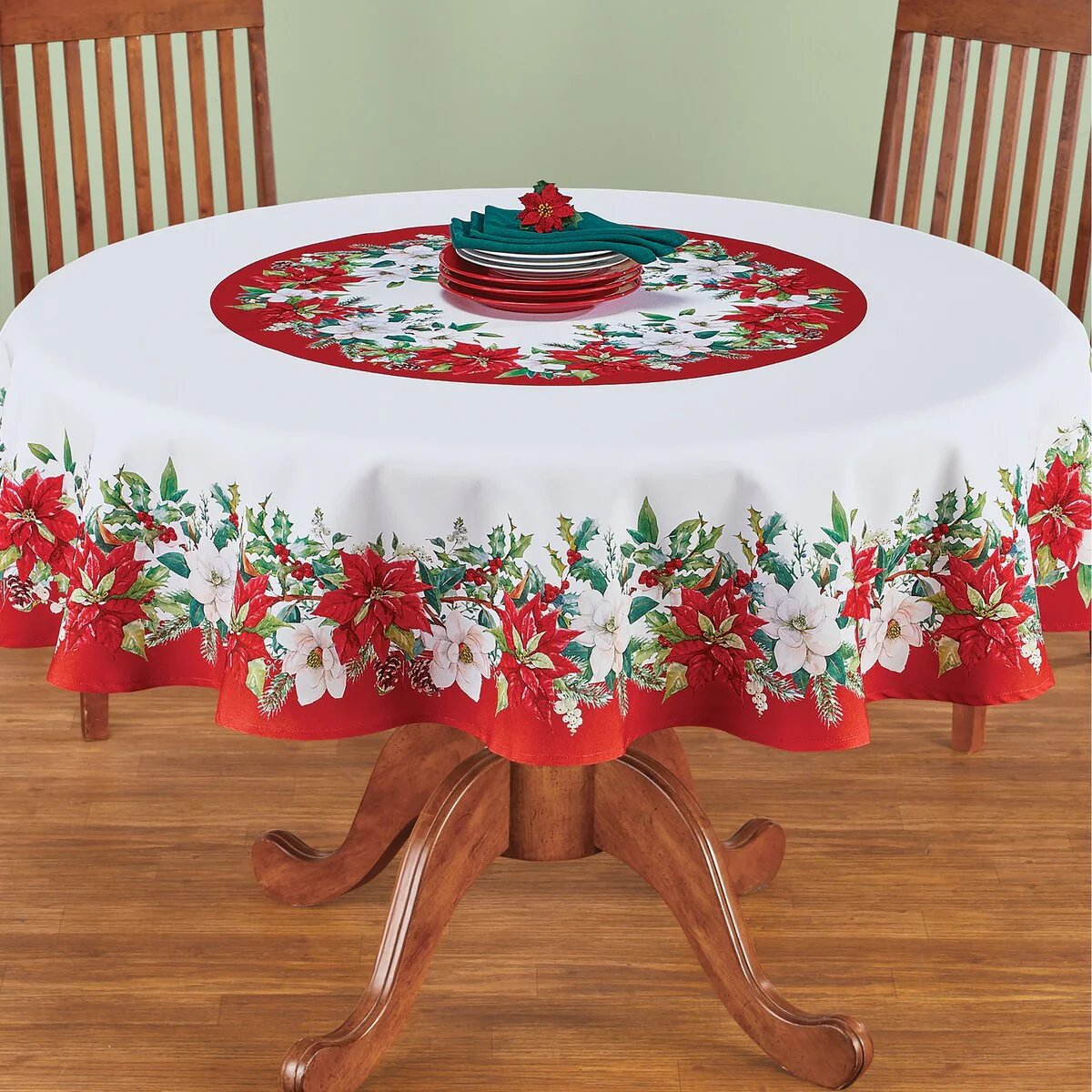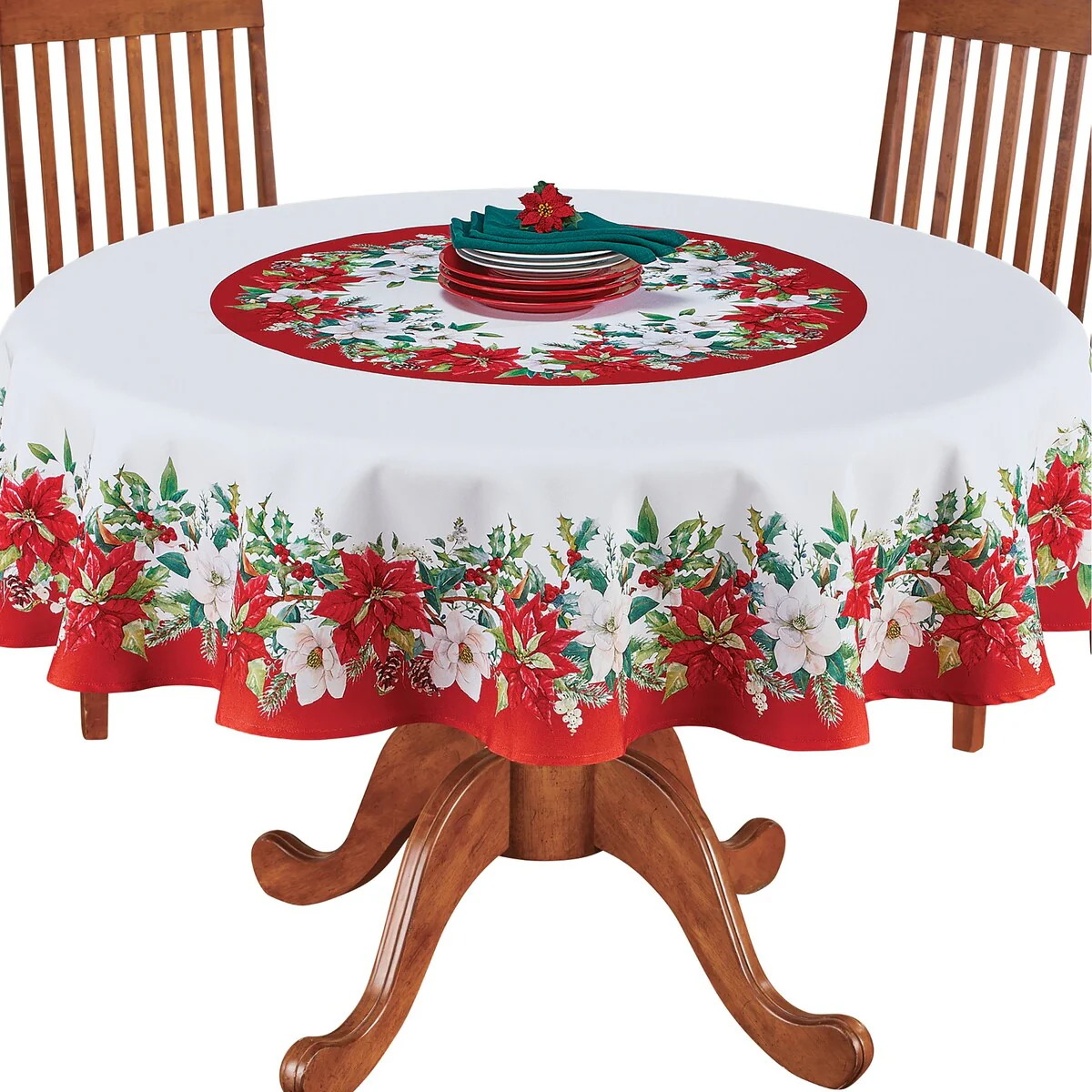 Dress your tables for the holiday season with these lovely linens. The white tablecloths feature a red and white poinsettia design with holly accents and a bright red border along the edges. Available in round or rectangle. Machine wash. Polyester; imported. Choose: Round (69 1/5"Dia.) or Rectangle (80"L x 60 1/2"W).