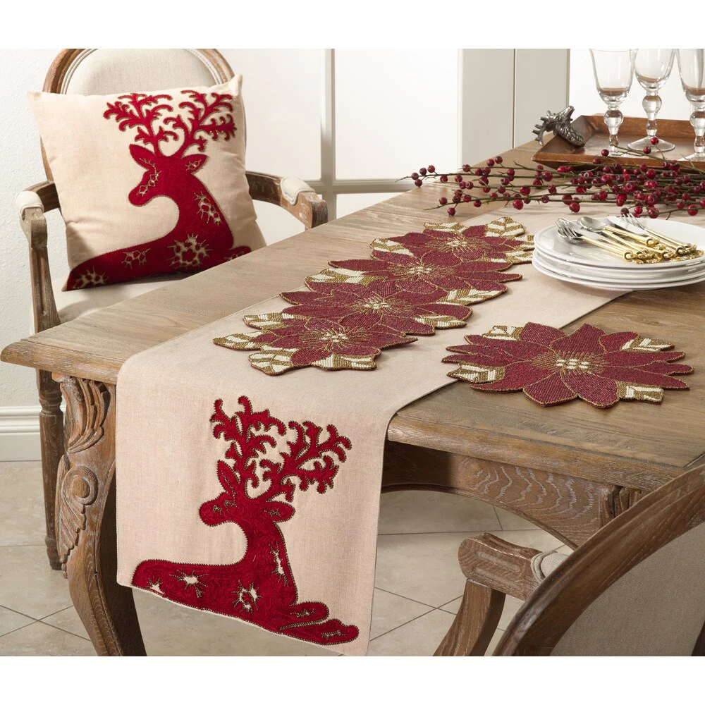 Deck the halls this Christmas season with this festive holiday table runner. Woven with cotton, the table runner features a red embroidered deer that is sure to spread holiday cheer all around. Pair the runner with red accents for a cohesive look.