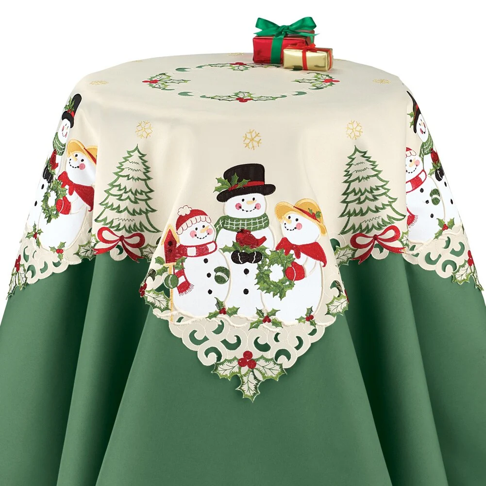 These beautiful linens feature colorful embroidery, delicate openwork & delightful details. A charming snowman family wears festive hats & scarves with embroidered holly leaves, berries, trees & sparkling gold lurex snowflakes. Machine wash. Polyester; imported. Size available in Runner (69"L x 13"W) or Square (34"Sq.).
