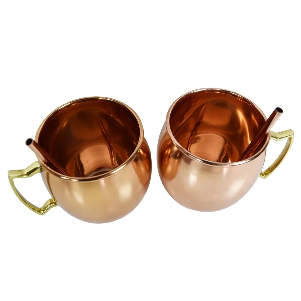 Our pair of Moscow Mule Mug cups offer more capacity than all other cups. With 17 oz ounce capacities each, you can enjoy your drink even longer. On top of that each and every piece is meticulously handcrafted one at a time with extra polishing to make them shine with silky smooth edges. We use 100% copper offering the best taste experience with every sip. The copper keeps your beverage ice cold and frosty. When the copper begins to oxidize, it boosts the aroma and enhances the taste of the ingredients. It also increases the bubbles in the carbonated ginger beer, bringing maximum fizz to the Moscow Mule. The citric acid from the lime juice is brought to life by the extra-cold copper, heightening the tangy citrus flavor and reducing the acidity which perfectly complements the spiciness of the ginger beer. The dimensions for the Solid Round Pair of 100% Copper Moscow Mule Mug Cups with Two Copper Straws 17 oz Ounce Smooth Handcrafted Finish are: 5" L x 3.5" W x 4" H
