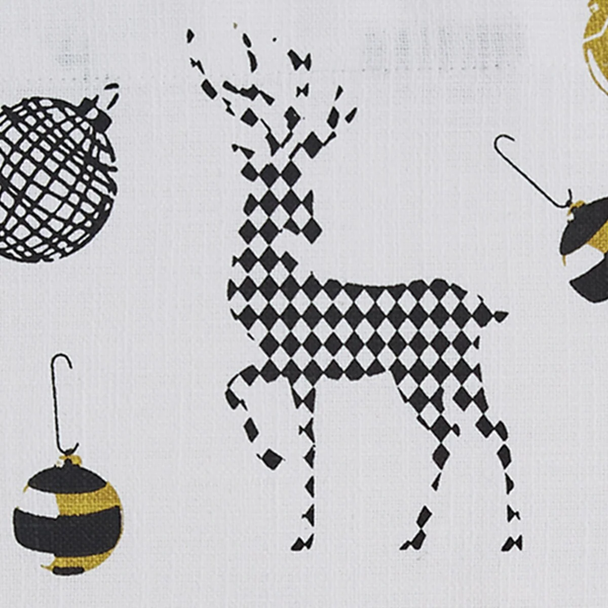 Decorate your cabin or country inspired home this winter holiday season using this lovely nature placemat set. Features a deer and Christmas ornament print with diamond and stripe patterns in golden yellow, white, and black hues on a plain, cream ground for a tabletop statement accessory in your dining room. Made from durable cotton cloth material that can be used time and time again, enhancing and bringing a warm welcome to your home decor to make every meal a special occasion.