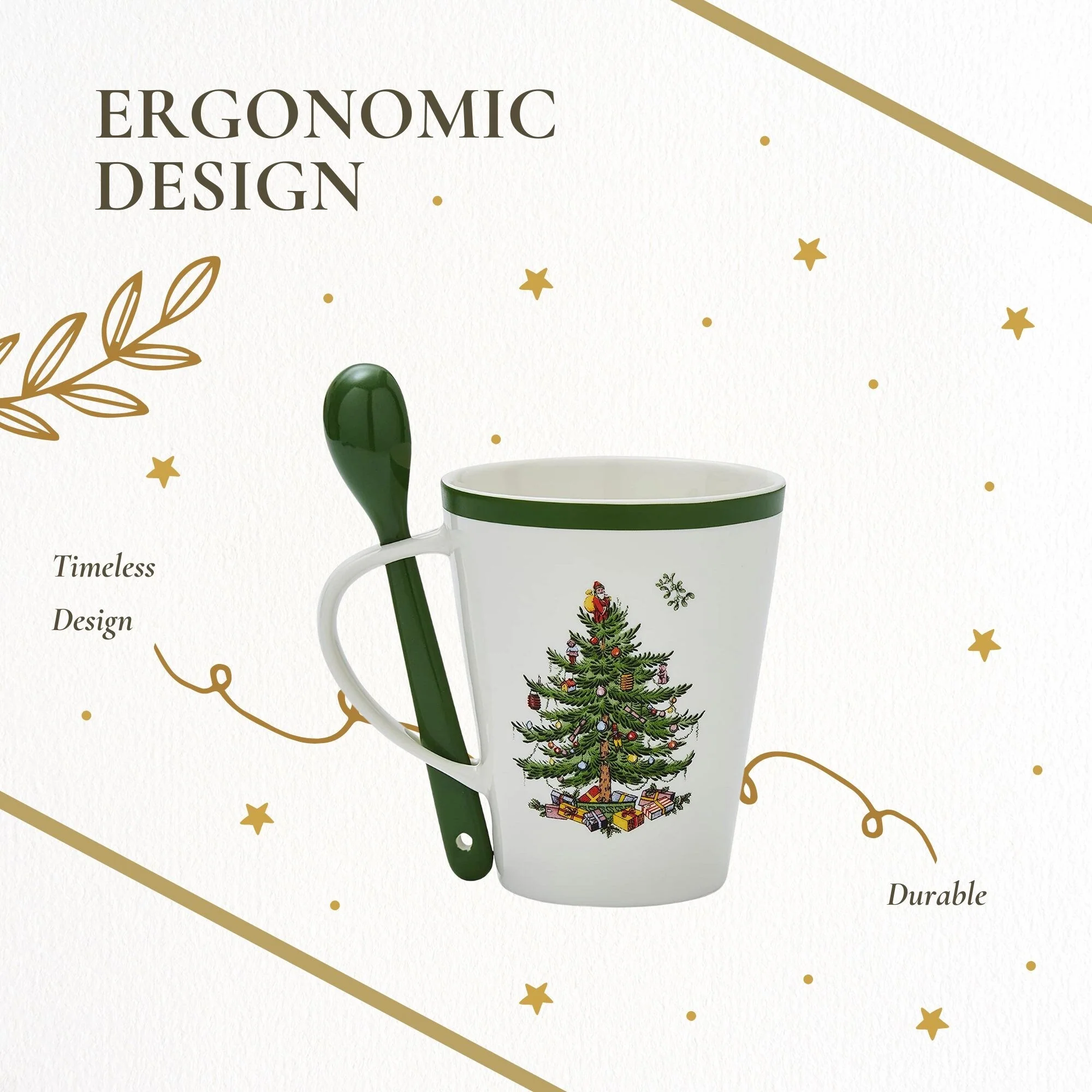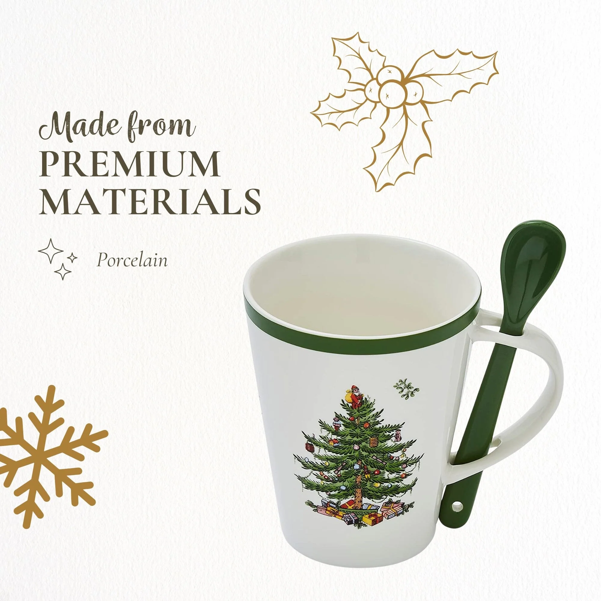 - Festive Design: Celebrate the season with this spoon and mug set, featuring a 14-ounce porcelain mug adorned with the iconic Christmas Tree motif, adding a cheerful touch to your morning coffee, tea, or hot cocoa.