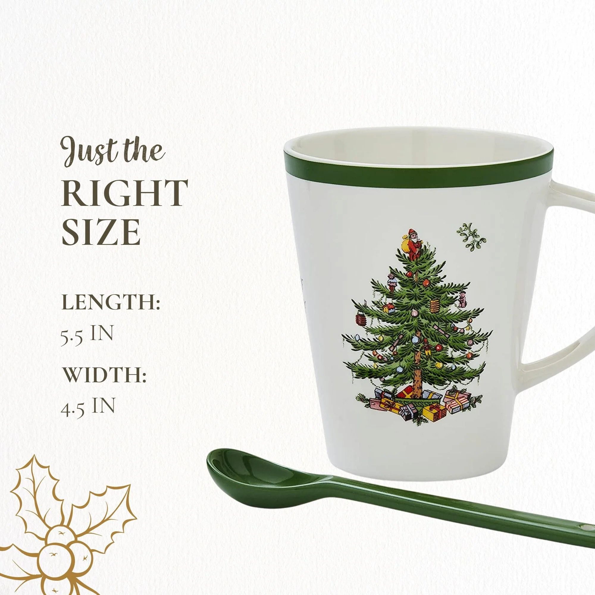 - Gift-Ready Packaging: This mug and spoon gift set comes in an elegant photo box, making it an ideal present for the holidays. Share the joy of the Spode Christmas Tree Collection with friends and family for a memorable gift exchange.