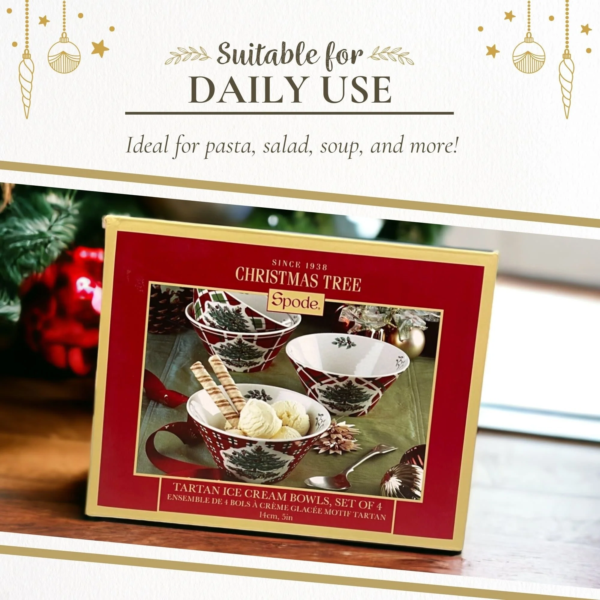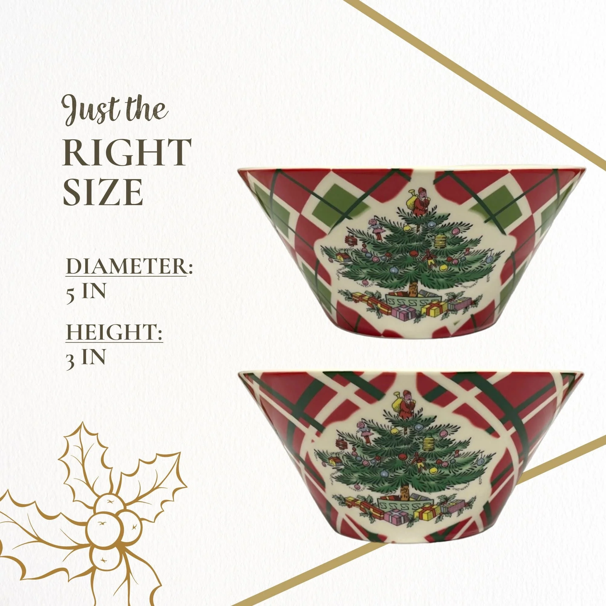 Spode Christmas Tree Tartan 5-inch Ice Cream Bowl - Set of 4 Holiday Treats, Dishwasher, Microwave, Freezer Safe, Ideal for Serving Desserts, Fruits for Holiday Gatherings - New